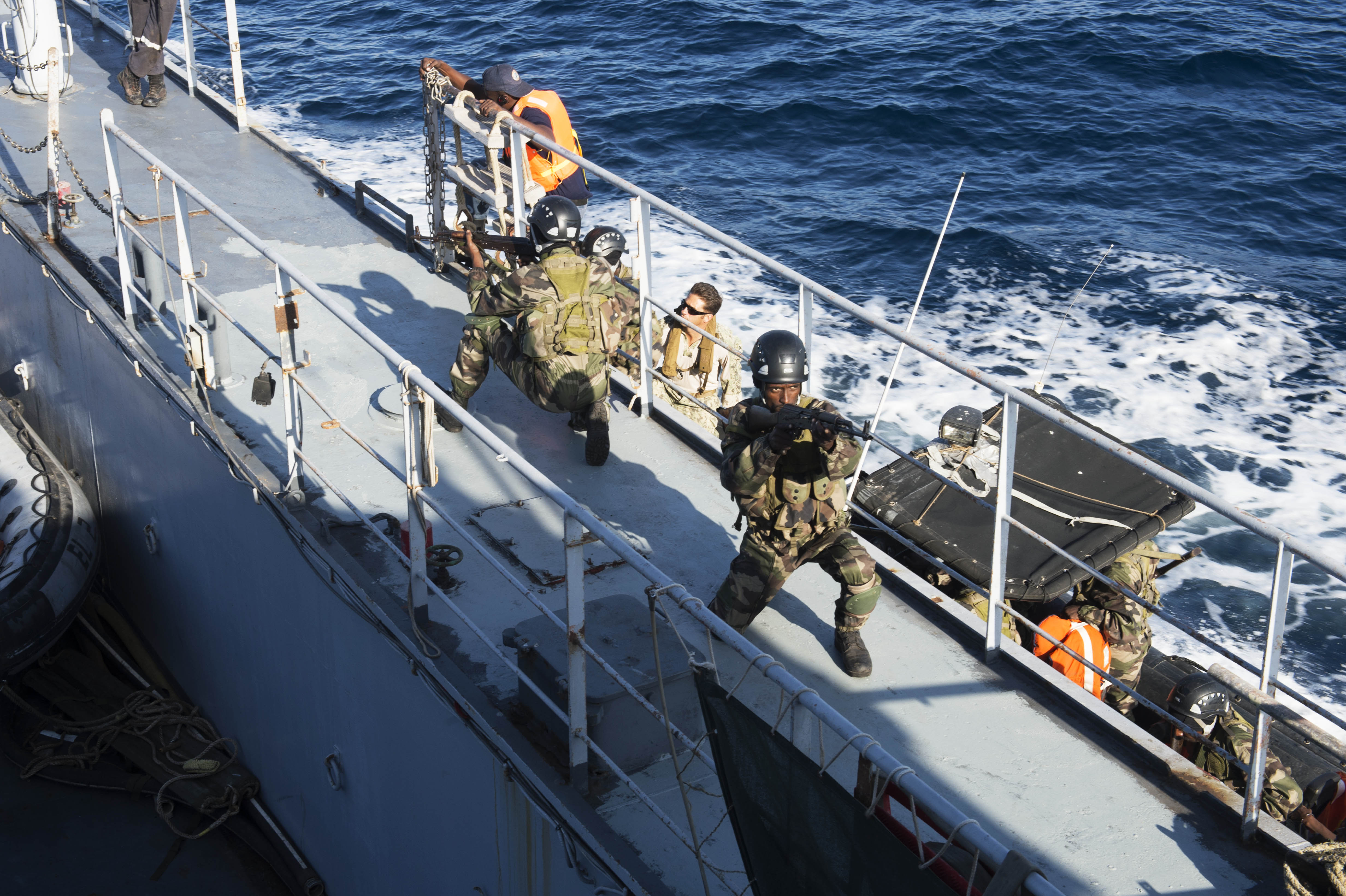 The Djiboutian navy Visit, Board, Search and Seizure team boards a simulated captured vessel, during Exercise Cutlass Express 2015 in Djibouti, Jan 31, 2015. Sponsored by U.S. Africa Command, Exercise Cutlass Express 2015 is designed to improve regional cooperation, maritime domain awareness and information sharing practices to increase capabilities of East African and Indian Ocean nations to counter sea-based illicit activity. (U.S. Air Force photo by Staff Sgt. Carlin Leslie)