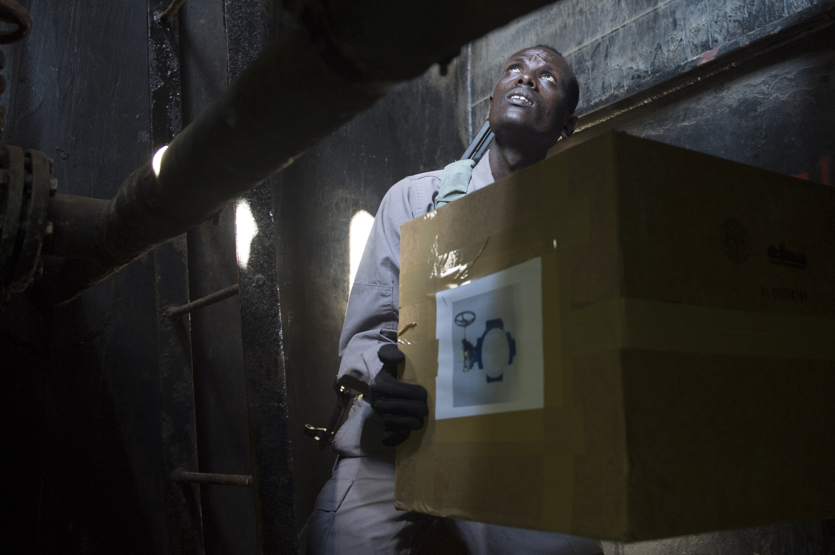 Djiboutian coast guard Visit, Board, Search and Seizure team members locate a role player hiding in the cabin of a simulated captured vessel during Exercise Cutlass Express 2015 in Djibouti,, Jan. 31, 2015. Sponsored by U.S. Africa Command, Exercise Cutlass Express 2015 is designed to improve regional cooperation, maritime domain awareness and information sharing practices to increase capabilities of East African and Indian Ocean nations to counter sea-based illicit activity. (U.S. Air Force photo by Staff Sgt. Carlin Leslie)