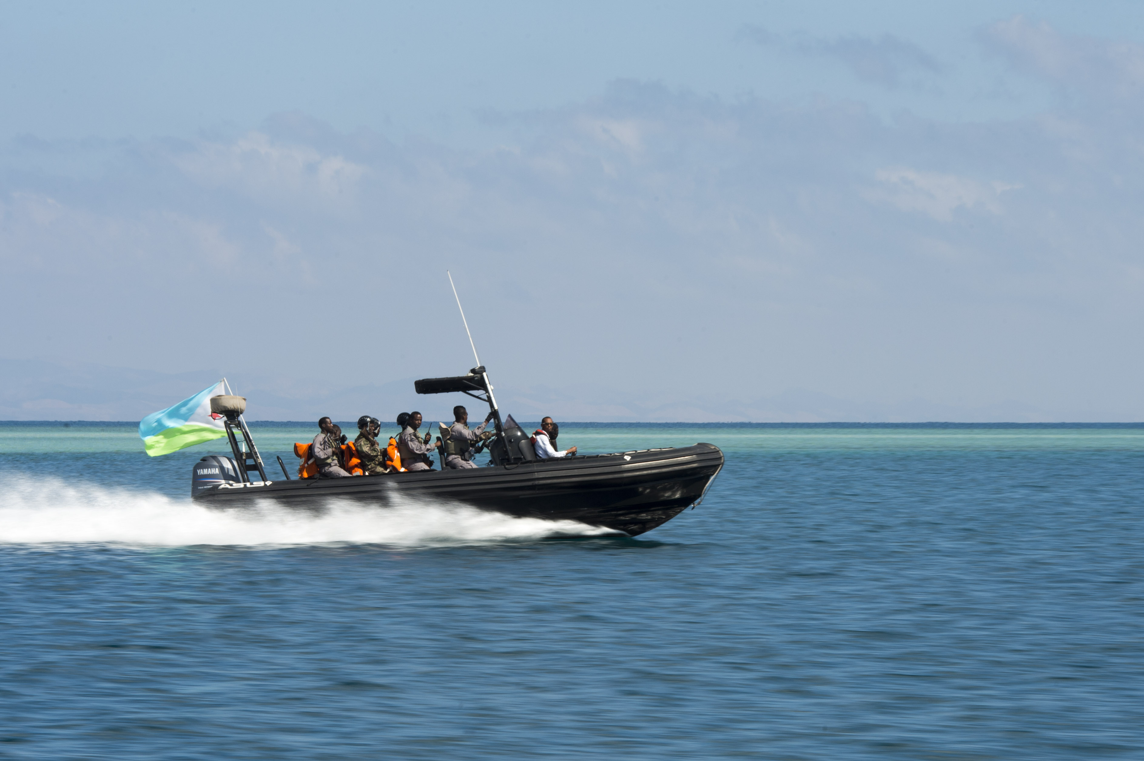 The Djibouti navy and coast guard boarding vessel begins the Visit, Board, Search and Seizure exercise as part of the Proliferation Security Initiative Support cell portion of Exercise Cutlass Express 2015 in Djibouti, Feb. 2, 2015. Sponsored by U.S. Africa Command, Exercise Cutlass Express 2015 is designed to improve regional cooperation, maritime domain awareness and information sharing practices to increase capabilities of East African and Indian Ocean nations to counter sea-based illicit activity. (U.S. Air Force photo by Staff Sgt. Carlin Leslie/Released)