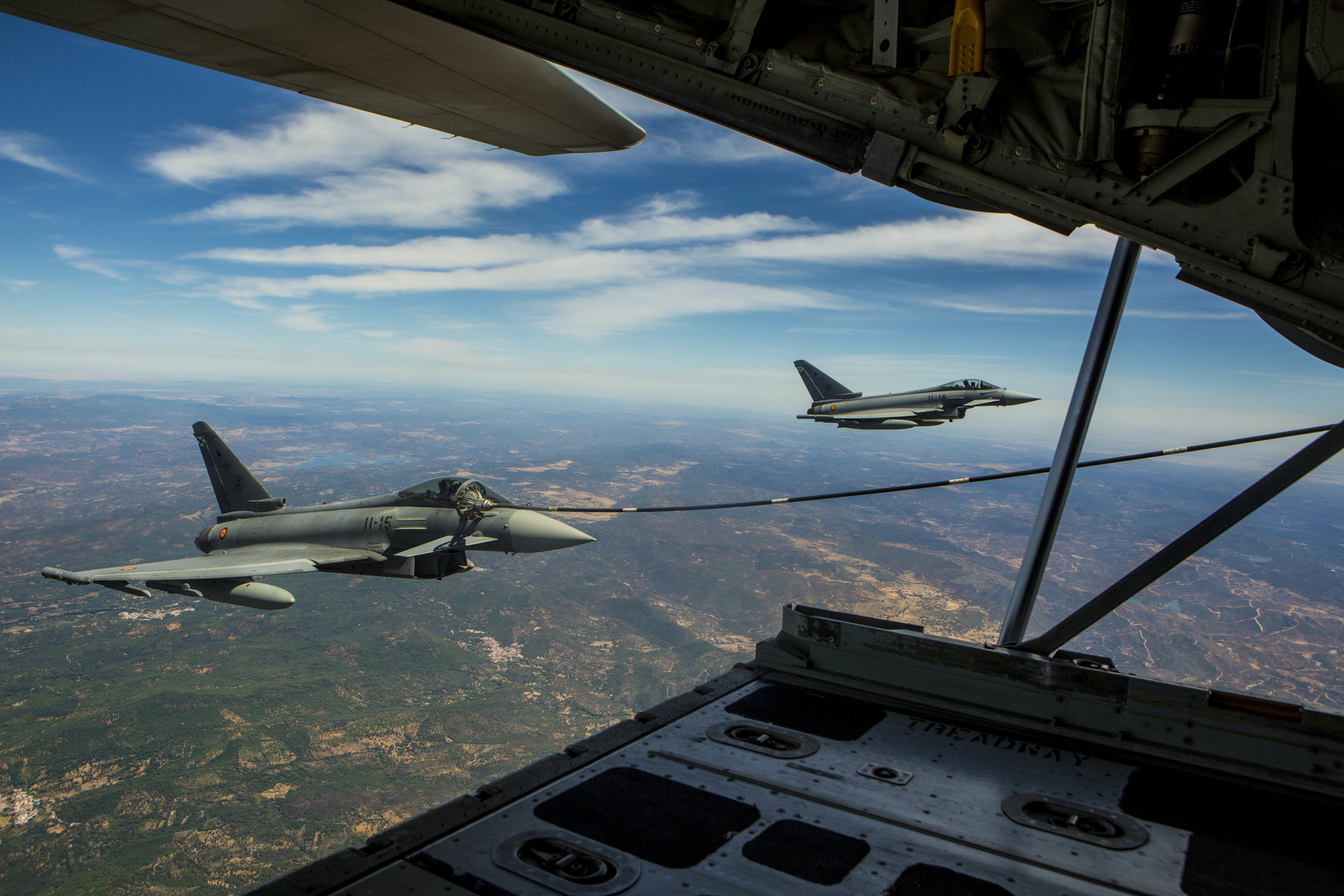 A Eurofighter Typhoon with the Spanish Air Force receives fuel from a U.S. Marine KC-130J Hercules with Special-Purpose Marine Air-Ground Task Force Crisis Response-Africa, August 13, in Spain. A total of five Spanish pilots and their aircraft had the opportunity to practice their air-to-air refueling skills with the Marines from SPMAGTF-CR-AF. While this particular training was a first for the two countries, the U.S. and Spain work together routinely, fostering one of the closest defense partnerships around the world.(U.S. Marine Corps photo by Staff Sgt. Vitaliy Rusavskiy/Released)
