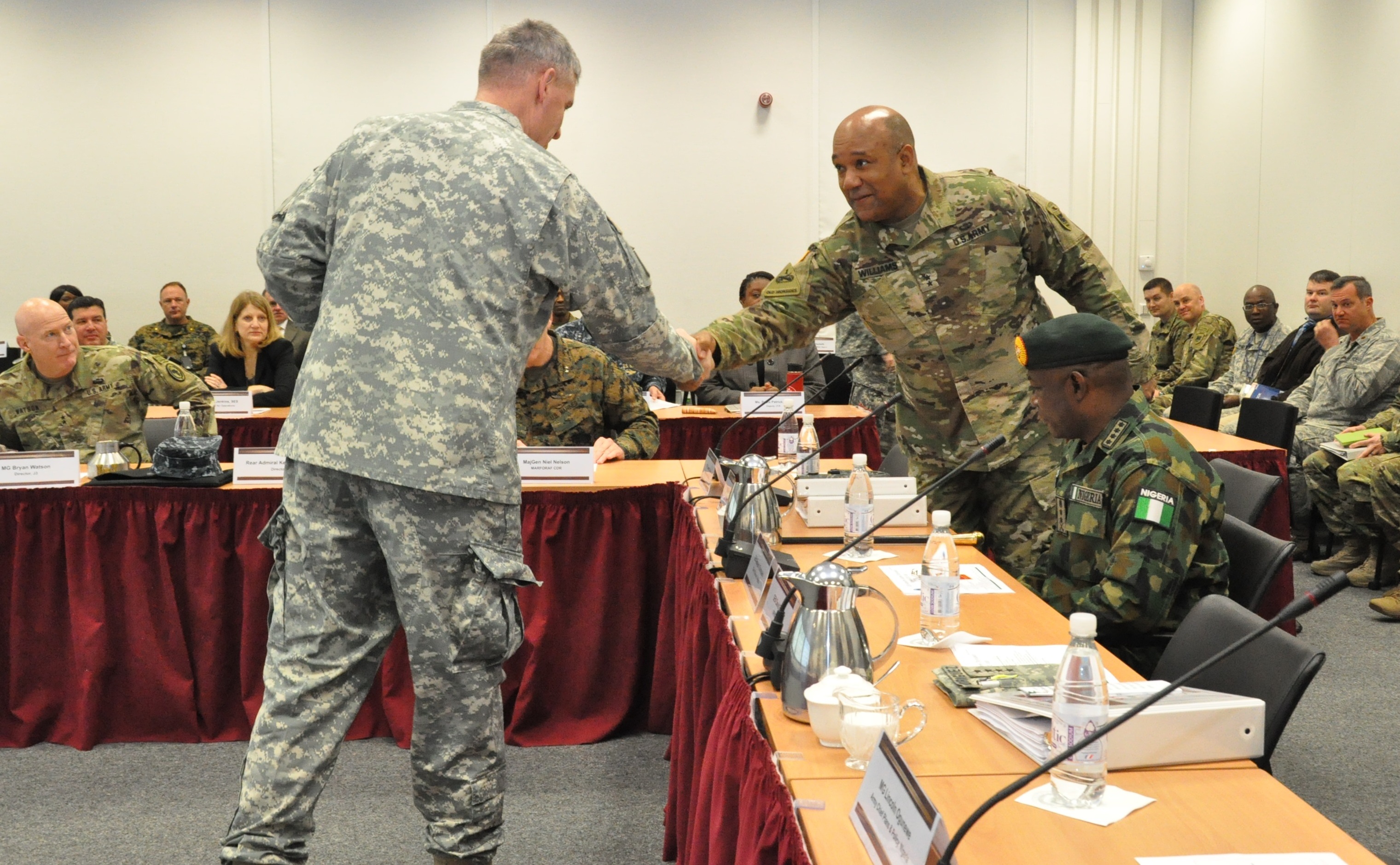 Nigeria Chief of Defence Staff (CDS) visits AFRICOM: Gen. David Rodriguez, commander, U.S. Africa Command welcomes Maj. Gen. Darryl Williams, Commander, U.S. Army Africa to a two-day meeting with Gen. Abayomi Olonisakin, Nigeria CDS, and several of his most senior officers. The purpose of the visit was to reinforce the importance of a strong US-Nigeria security cooperation relationship, with topics focused on ways to counter terrorism, joint operations, logistics and maritime security in the Gulf of Guinea, Feb. 9, 2016, U.S. Army Garrison Stuttgart, Germany. (Photo by Brenda Law, U.S. Africa Command Public Affairs/RELEASED)