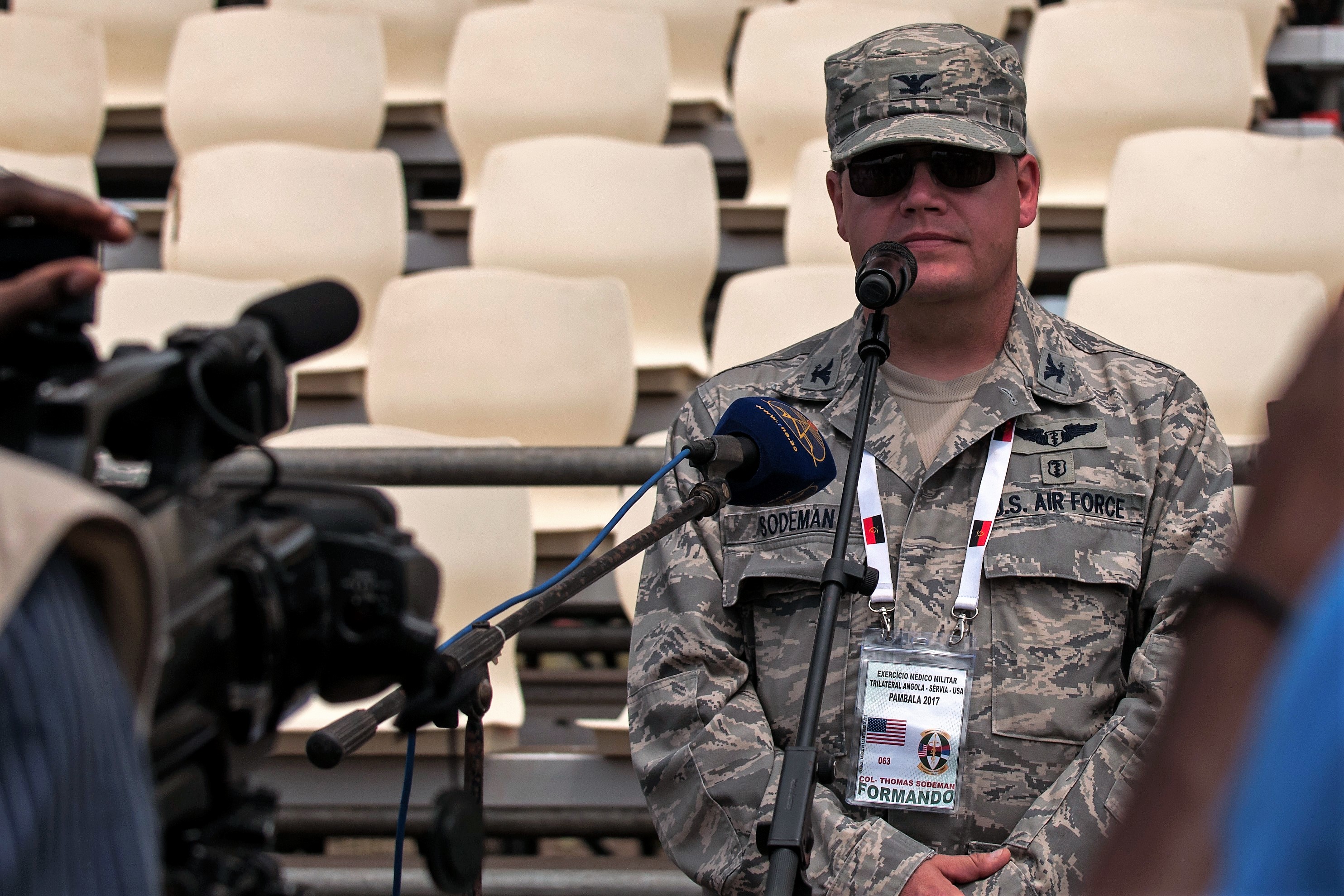 Col. Thomas Sodeman, commander of the Ohio National Guard forces for PAMBALA 2017, gives his remarks during the closing ceremony and VIP day for the PAMBALA 2017 exercise Dec. 14, 2017, in Bengo Province, Angola. Highlights of the event included a demonstration of an infectious disease crisis response by the Angolan police and firefighting units, the Angolan Armed Forces and some of the Serbian and Ohio National Guard personnel. (Ohio National Guard photo by Staff Sgt. Wendy Kuhn