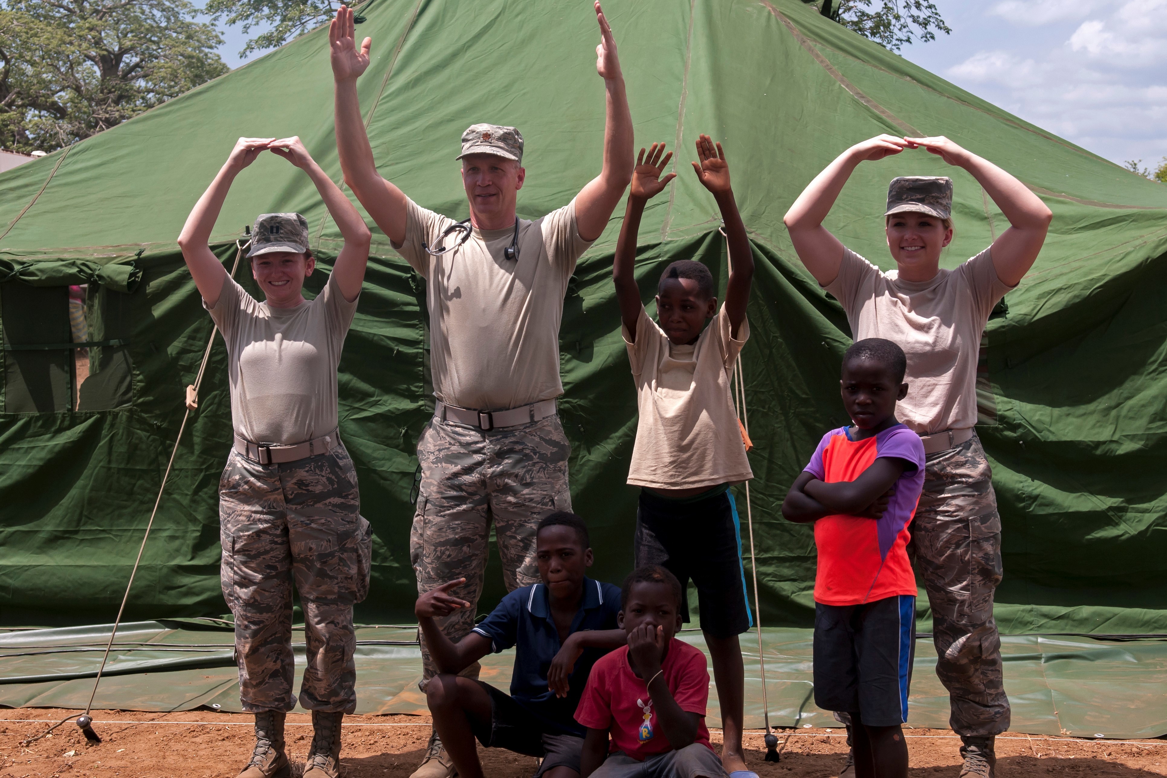 Ohio Air National Guard members Capt. Sarah Woodson (from left), Maj. Adam Bihl and Senior Airman Hannah Halcomb play with children in the village of Ceramica and show some state pride by forming the “O-H-I-O” the PAMBALA 2017 exercise Dec. 13, 2017, in Bengo Province, Angola, Dec. By participating in this trilateral medical engagement alongside the Angolan and Serbian Armed Forces, the Ohio National Guard is gaining real-world experience and training on tropical diseases while also providing valuable coaching and mentorship on disease management and containment. This engagement is the first of its kind to take place in the Republic of Angola and is part of a trilateral agreement between Angola, Serbia and the U.S. (Ohio National Guard photo by Staff Sgt. Wendy Kuhn)