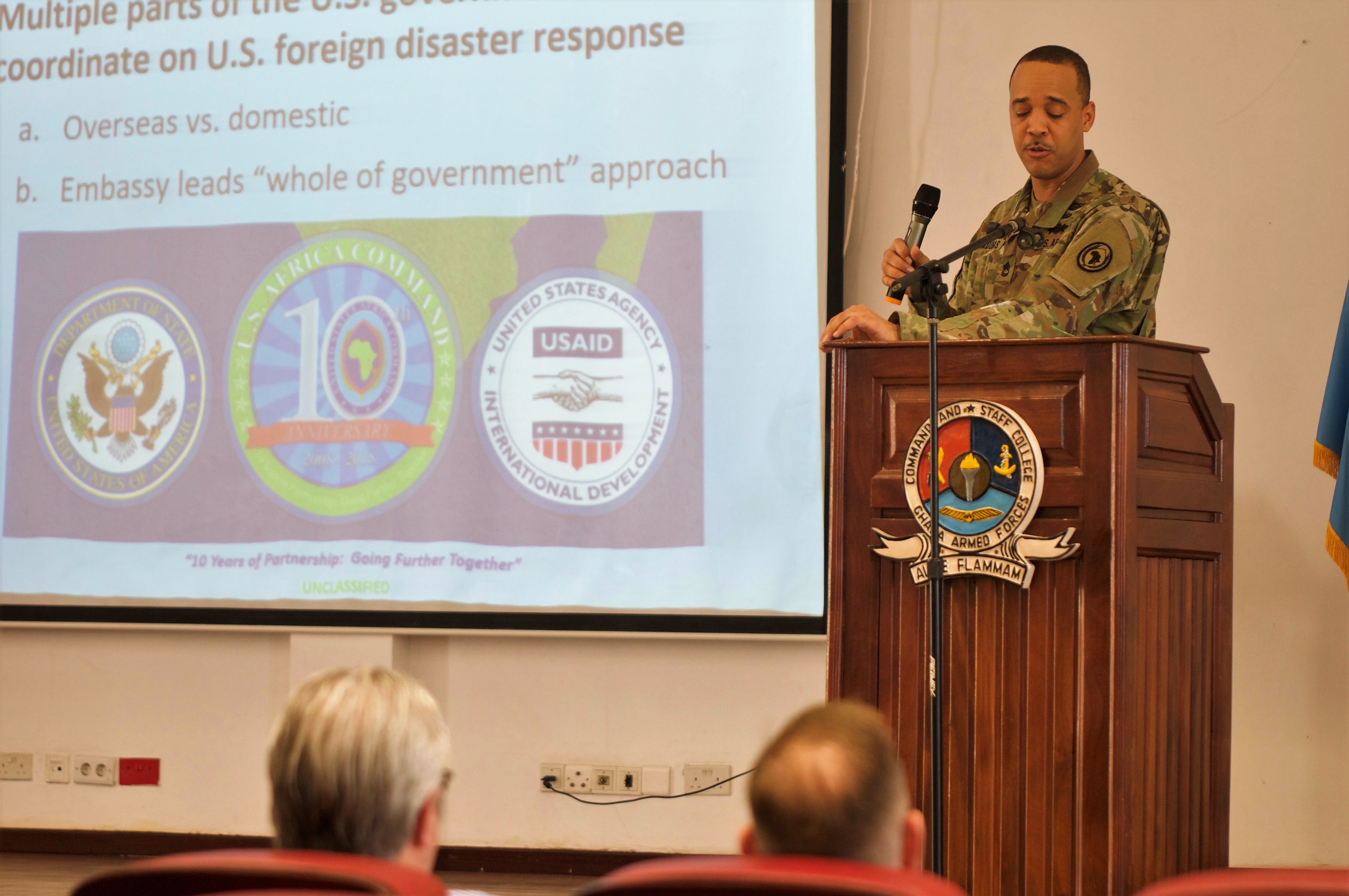USAID Office of Foreign Disaster Assistance (OFDA) provided an overview of the U.S. foreign disaster response process; AFRICOM J5 Civil Affairs officers LTC Matthew Holmes and non-commissioned officer in-charge (NCOIC) Sgt. First Class Rahsann Soumas explained the U.S. military’s supporting role in foreign disaster response.