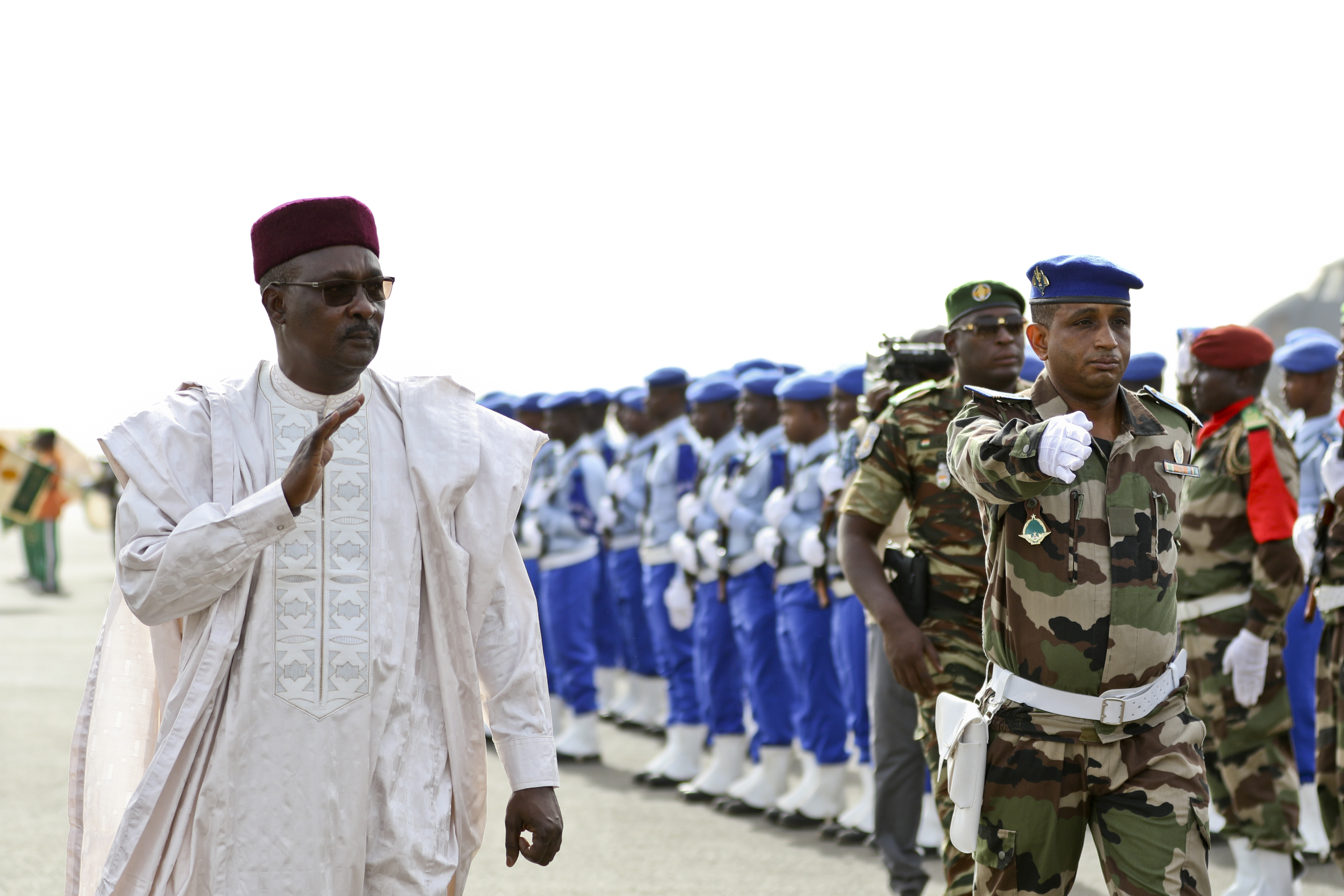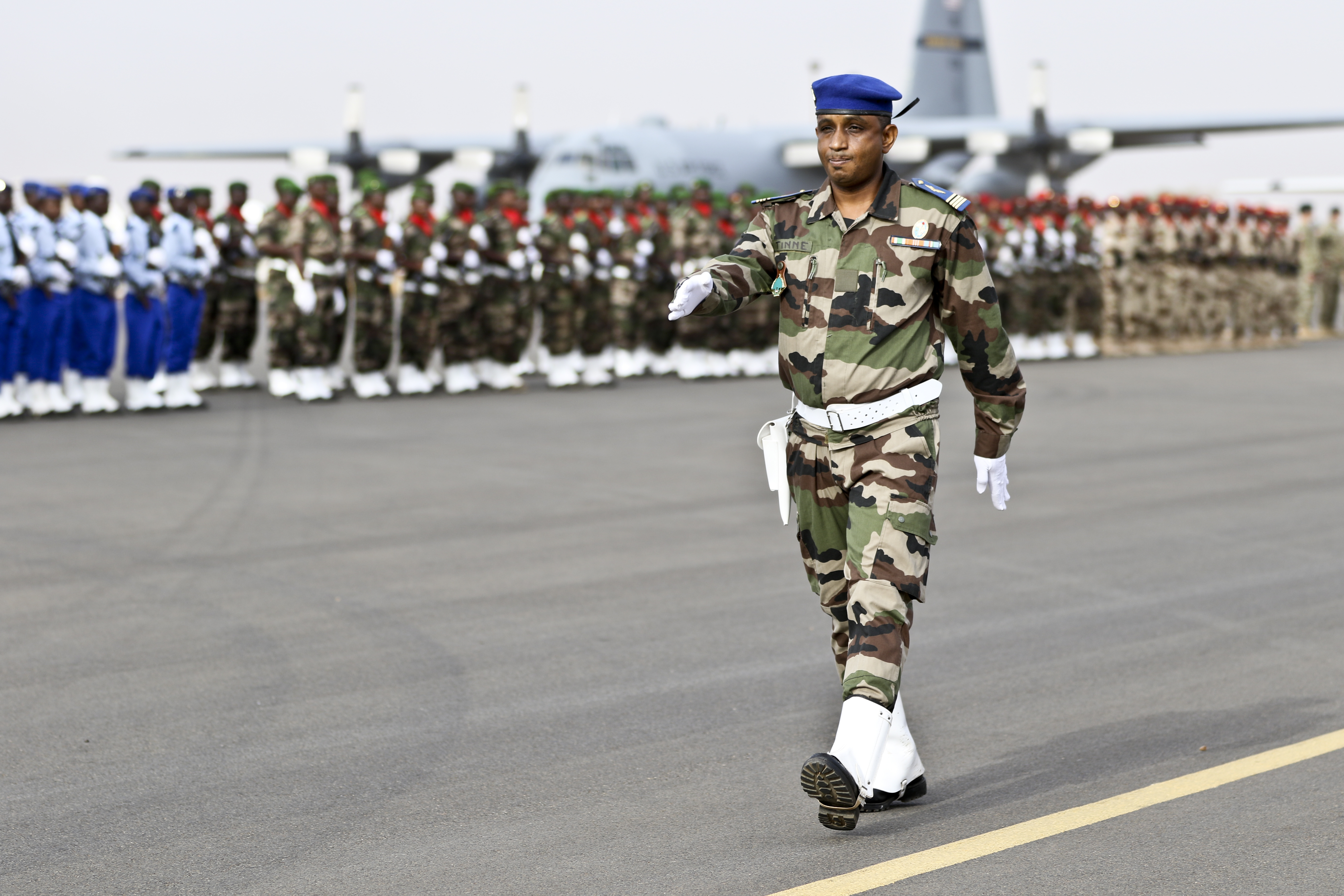 NIAMEY, Niger – Moutari Kalla, Nigerien Minister of Defense, inspects the troops to start off the opening ceremony of Flintlock 2018 in Niamey, Niger, April 11, 2018. Approximately 1,900 service members from more than 20 African and western partner nations are participating in Flintlock 2018 at multiple locations in Niger, Burkina Faso, and Senegal. (U.S. Army Photo by Sgt. Heather Doppke/79th Theater Sustainment Command)