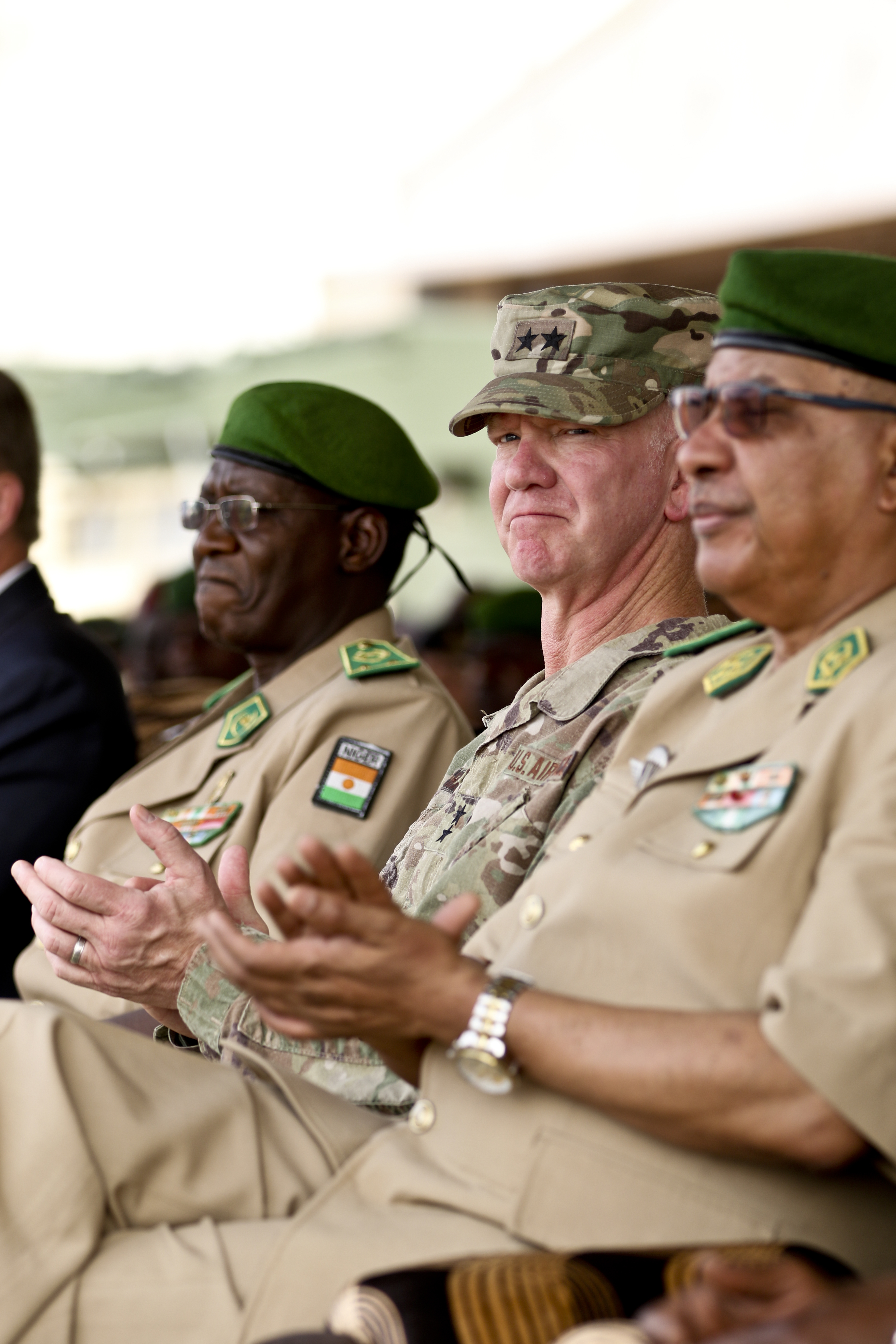 NIAMEY, Niger – U.S. Air Force Maj. Gen. Marcus Hicks, commander, Special Operations Command Africa, applauds during the opening ceremony of Flintlock 2018 in Niamey, Niger, April 11, 2018. Approximately 1,900 service members from more than 20 African and western partner nations are participating in Flintlock 2018 at multiple locations in Niger, Burkina Faso, and Senegal. (U.S. Army Photo by Sgt. Heather Doppke/79th Theater Sustainment Command)