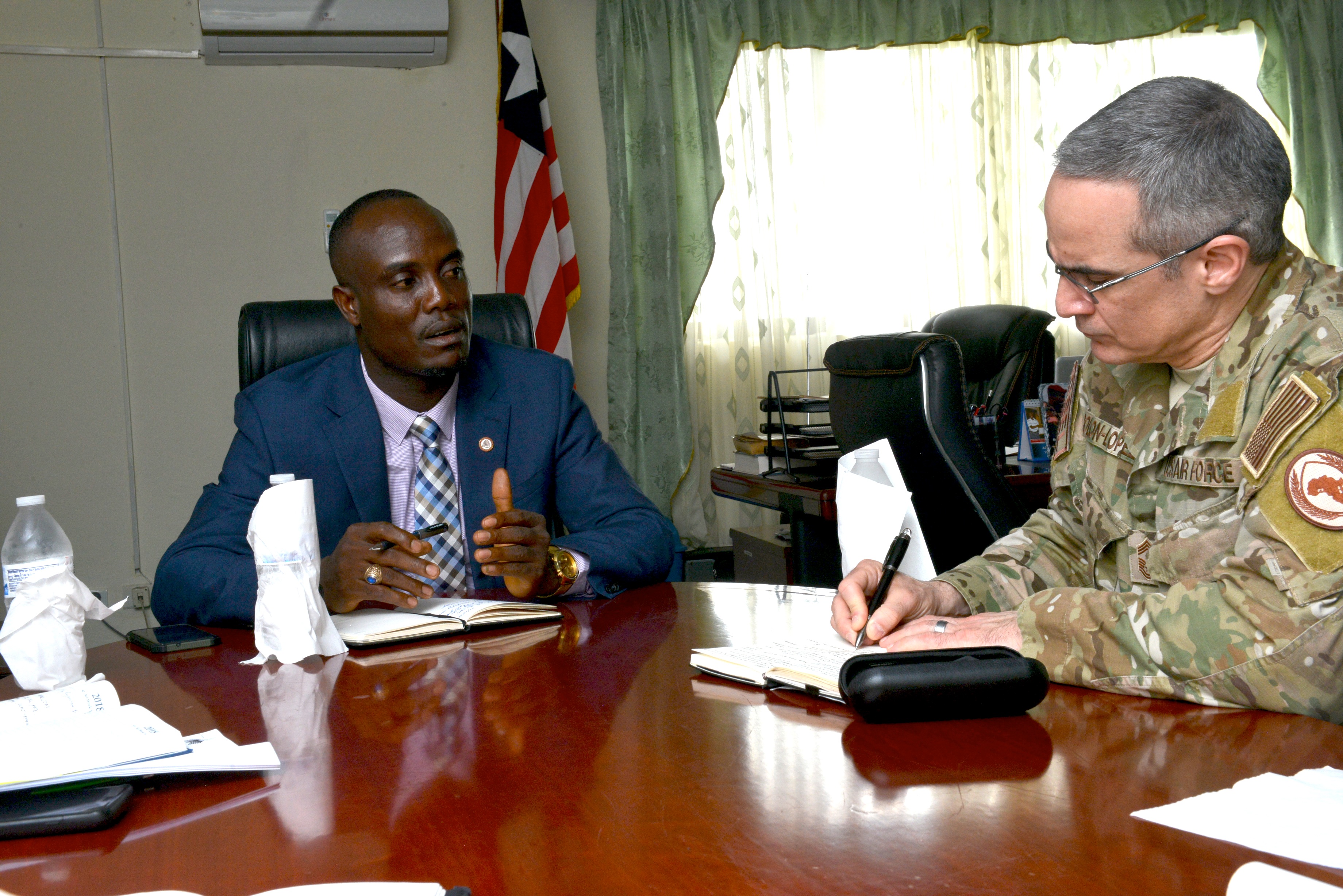 Liberia Minister of National Defense Daniel Ziankahn and U.S. Africa Command command senior enlisted leader, Chief Master Sgt. Ramon Colon-Lopez, engage in discussion, April 2, 2018, at the Liberia MOD office in Monrovia. The event was a part of a 3-day visit to the region to foster the partnership between AFRICOM and the Armed Forces of Liberia (AFL) following the close of the United Nations Peacekeeping Mission in Liberia (UNMIL).