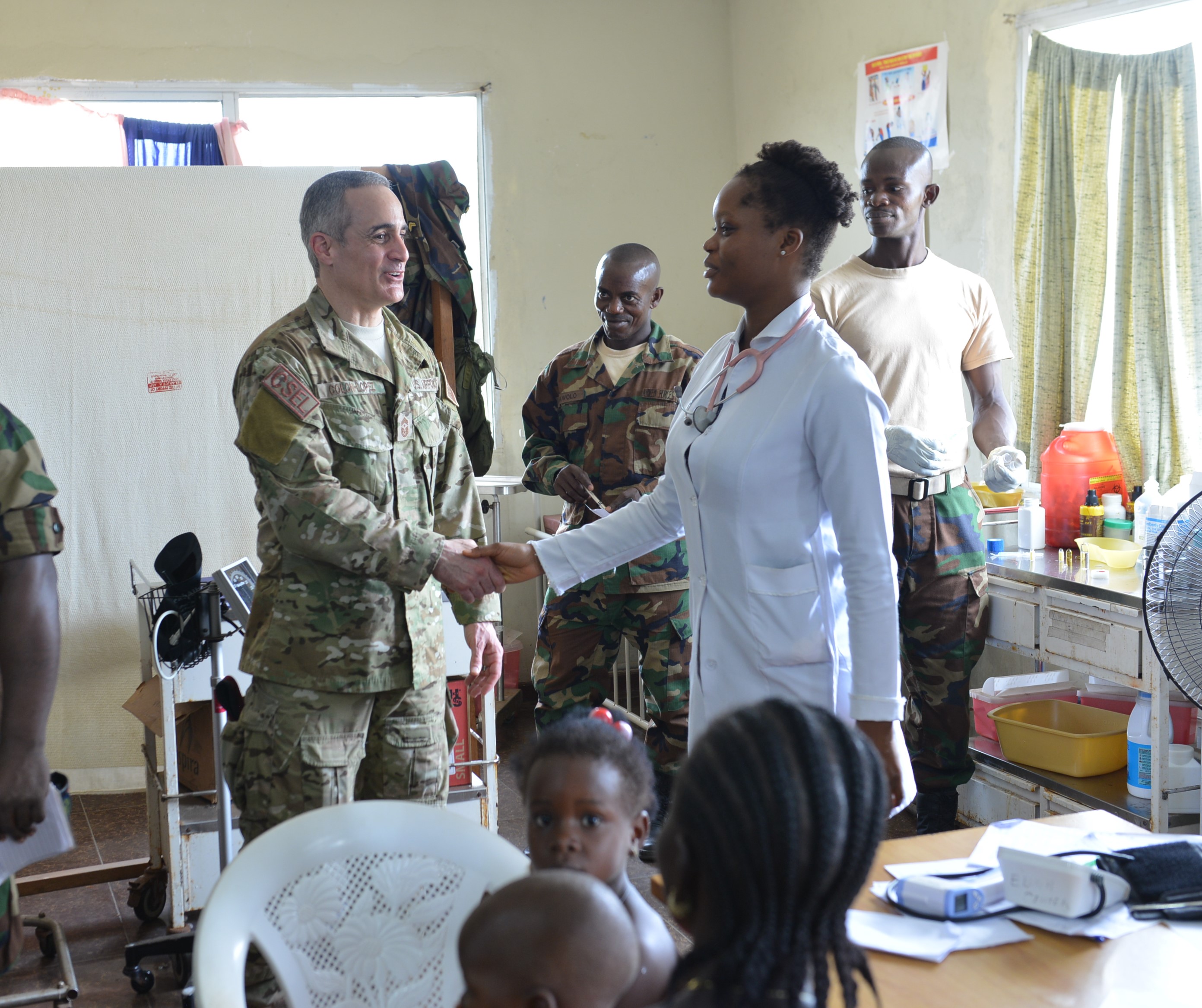 U.S. Africa Command Senior Enlisted Leader, Chief Master Sgt. Ramon Colon-Lopez , shakes hands with Dr. Zoe Parwon, a medical doctor working at the Kessley Barracks Health Center in Monrovia, April 3, 2018. The event was a part of a 3-day site visit to the region in order to foster the partnership between AFRICOM and the Armed Forces of Liberia (AFL) following the close of the United Nations Peacekeeping Mission in Liberia (UNMIL).