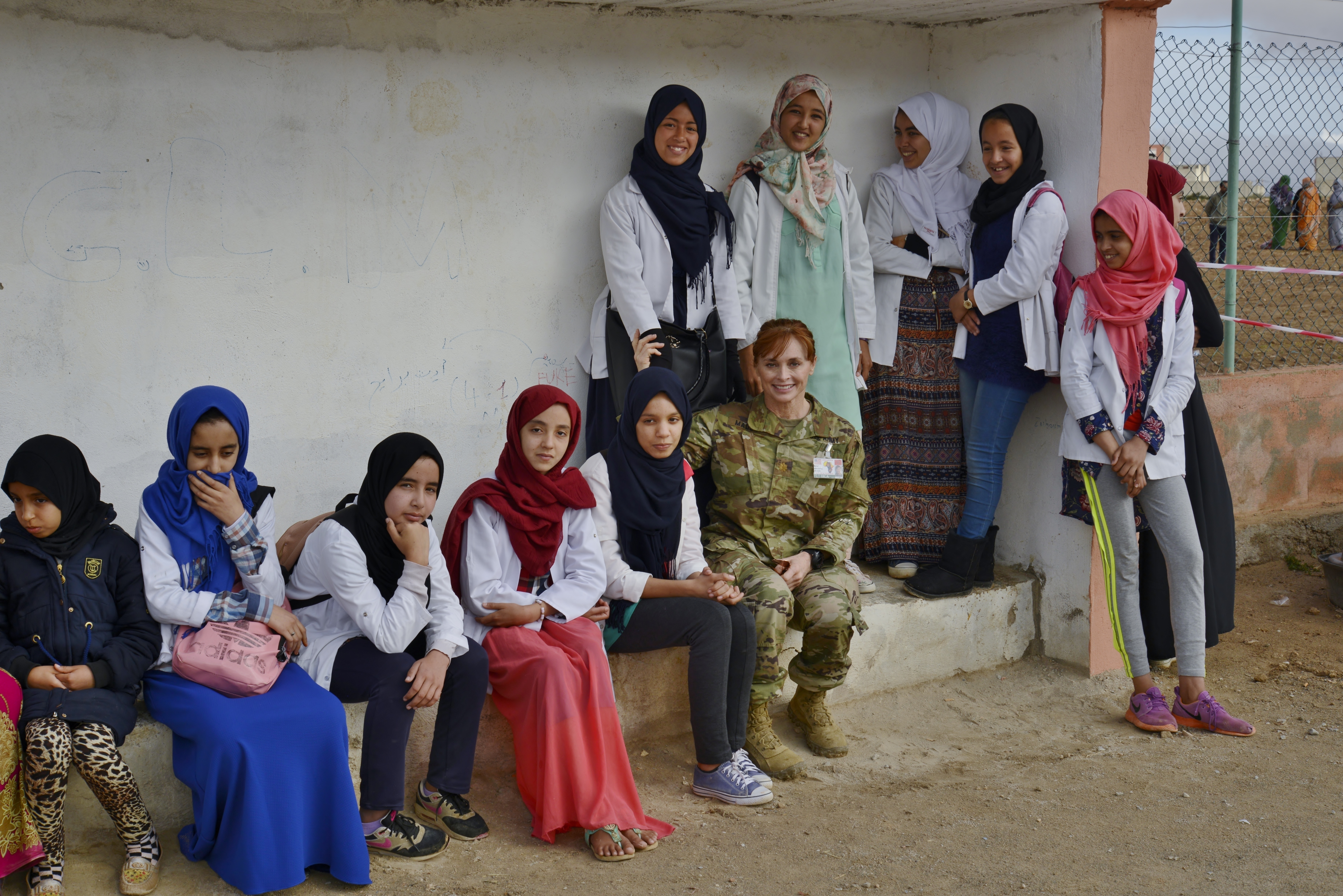 Major Samantha Madsen, a planner for the Utah Army National Guard, poses for a picture with Moroccan women and young girls waiting for dental services during the Humanitarian Civic Assistance component of Exercise African Lion 2018 in Bounaamane, Morocco, April 24, 2018. Exercise African Lion 2018 is a Chairman of the Joint Chiefs of Staff-sponsored, U.S. African Command-scheduled, U.S. Marine Corps Forces Europe and Africa-led, joint and combined exercise conducted in the Kingdom of Morocco. African Lion offers an opportunity to improve interoperability and cooperation while demonstrating the strong military bond that exists between the participating nations. (U.S. Army National Guard photo by Maj. Samantha Madsen)
