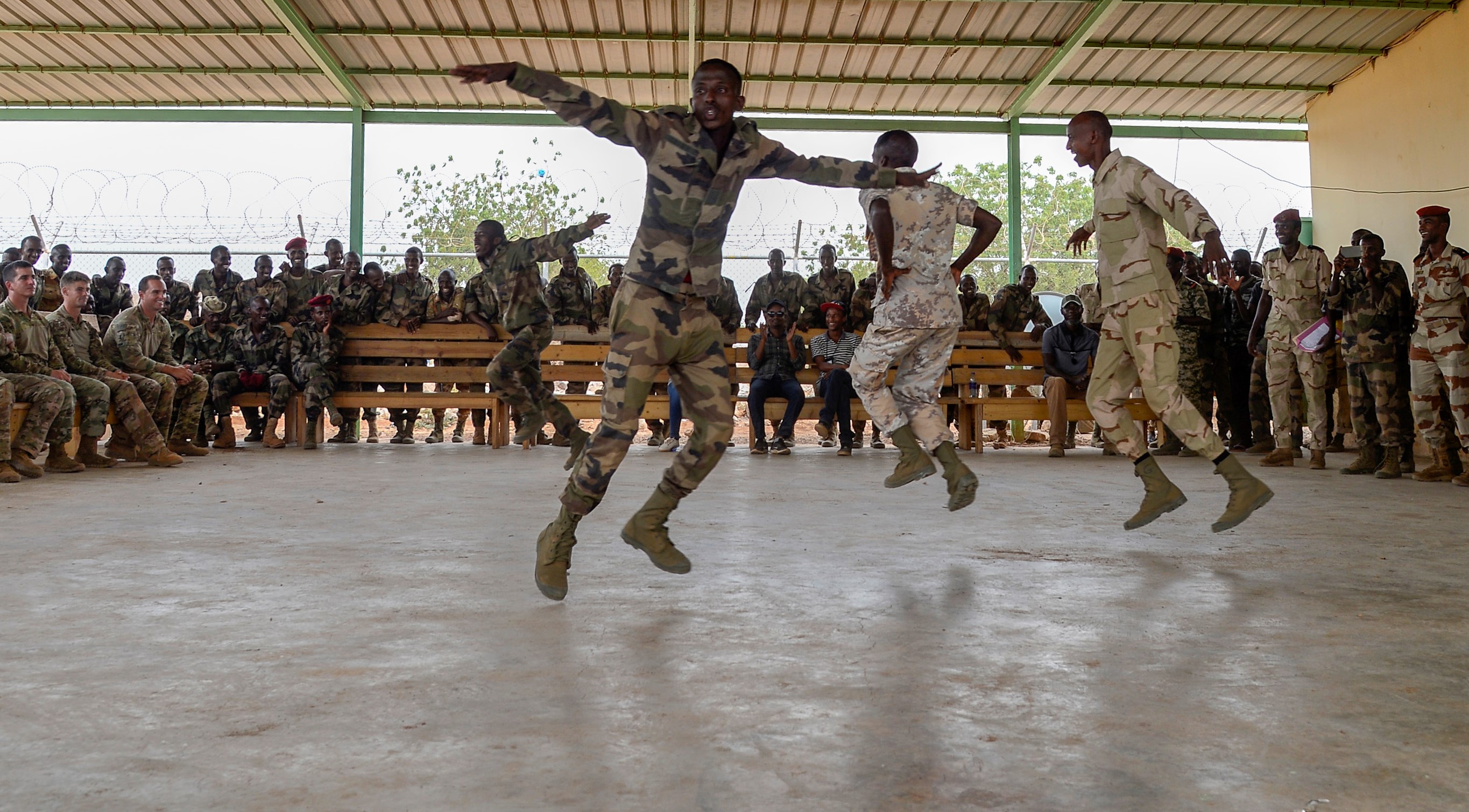 Members of the Djiboutian Army’s Rapid Intervention Battalion (RIB) perform a traditional Somali dance during a celebration for new RIB graduates at a training site outside Djibouti City, June 28, 2018. The RIB is a U.S. Army trained unit that was formed to respond to crises and promote regional security and stability in East Africa. (U.S. Navy Photo by Mass Communication Specialist 2nd Class Timothy M. Ahearn)