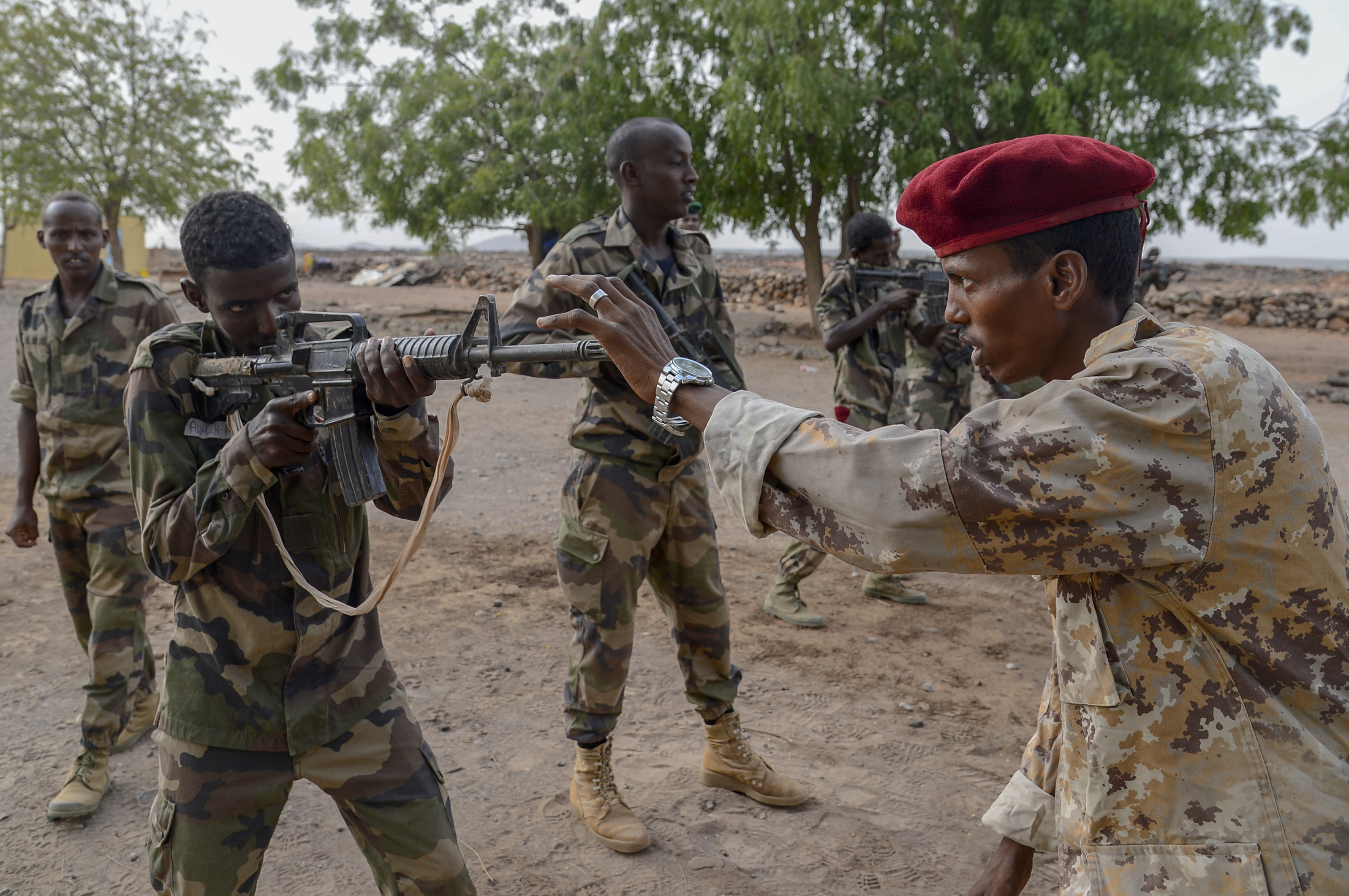 A non-commissioned officer with the Djiboutian Army’s Rapid Intervention Battalion (RIB) instructs a new recruit at a training site outside Djibouti City, July 3, 2018. The RIB is a U.S. Army trained unit that was formed to respond to crises and promote regional security and stability in East Africa. (U.S. Navy Photo by Mass Communication Specialist 2nd Class Timothy M. Ahearn)