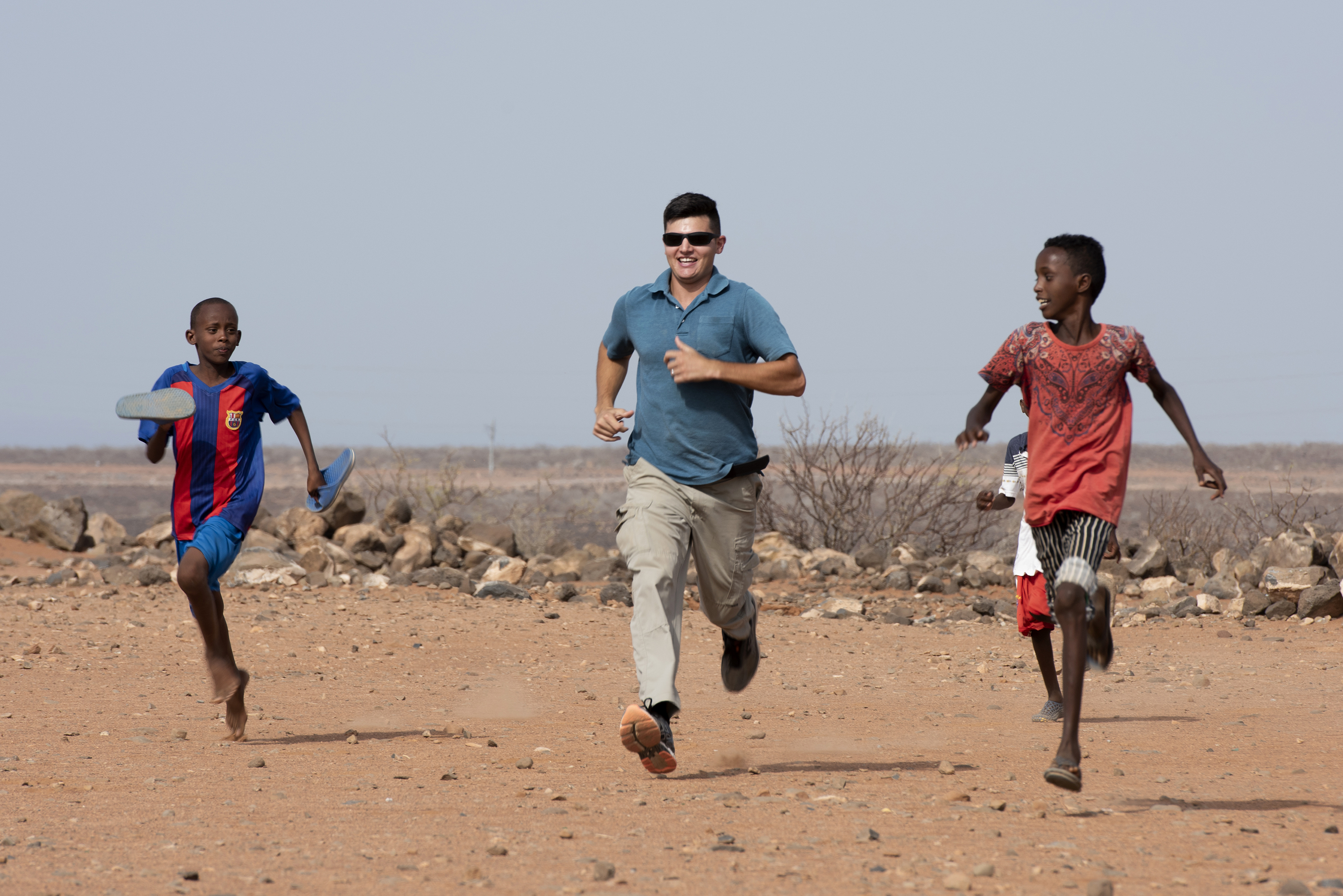 U.S. Air Force 1st Lt. Darren Domingo, officer in charge, Combat Camera, assigned to Combined Joint Task Force - Horn of Africa, races with a child from the local village outside of Chebelley Village, Djibouti, Aug. 3, 2018. Domingo was one of 30 service members participating in an outreach event organized by the 404th Civil Affairs Battalion. (U.S. Air National Guard photo by Master Sgt. Sarah Mattison)