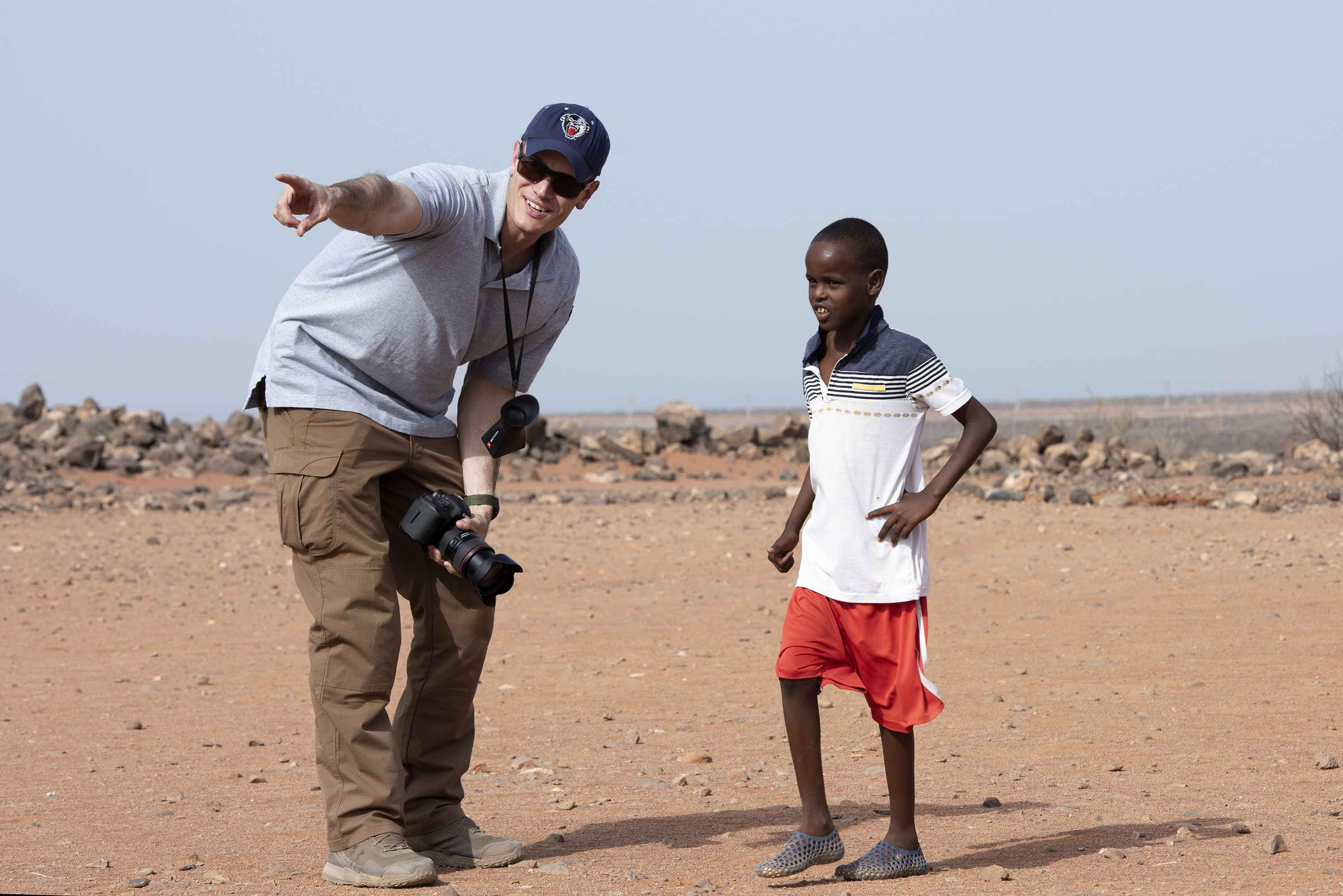 U.S. Air Force Master Sgt. Andrew Sinclair, broadcaster, Combined Joint Task Force - Horn of Africa, public affairs, speaks with a Djiboutian child outside of Chebelley village, Djibouti, Aug. 3, 2018. Sinclair was there to document a soccer game as part of a community engagement event organized by the 404th Civil Affairs Battalion. (U.S. Air National Guard photo by Master Sgt. Sarah Mattison)