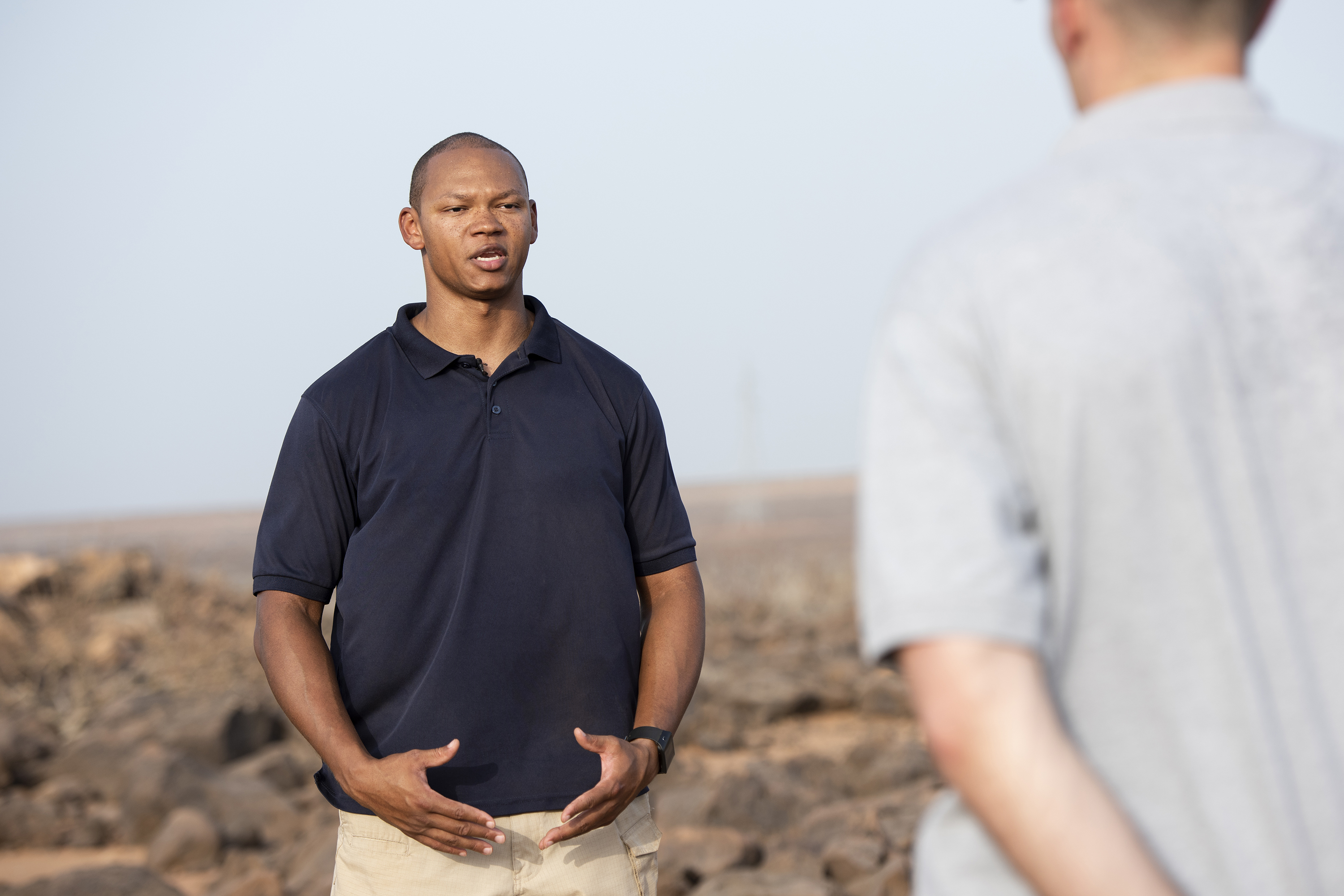 U.S. Army Capt. Deandre Garlington, civil affairs officer, 404th Civil Affairs Battalion, Combined Joint Task Force - Horn of Africa, answers questions during an interview outside Chebelley Village, Djibouti, Aug. 3, 2018. Over 30 Soldiers and Airmen volunteered for the outreach event organized by the 404th Civil Affairs Battalion. (U.S. Air National Guard photo by Master Sgt. Sarah Mattison)