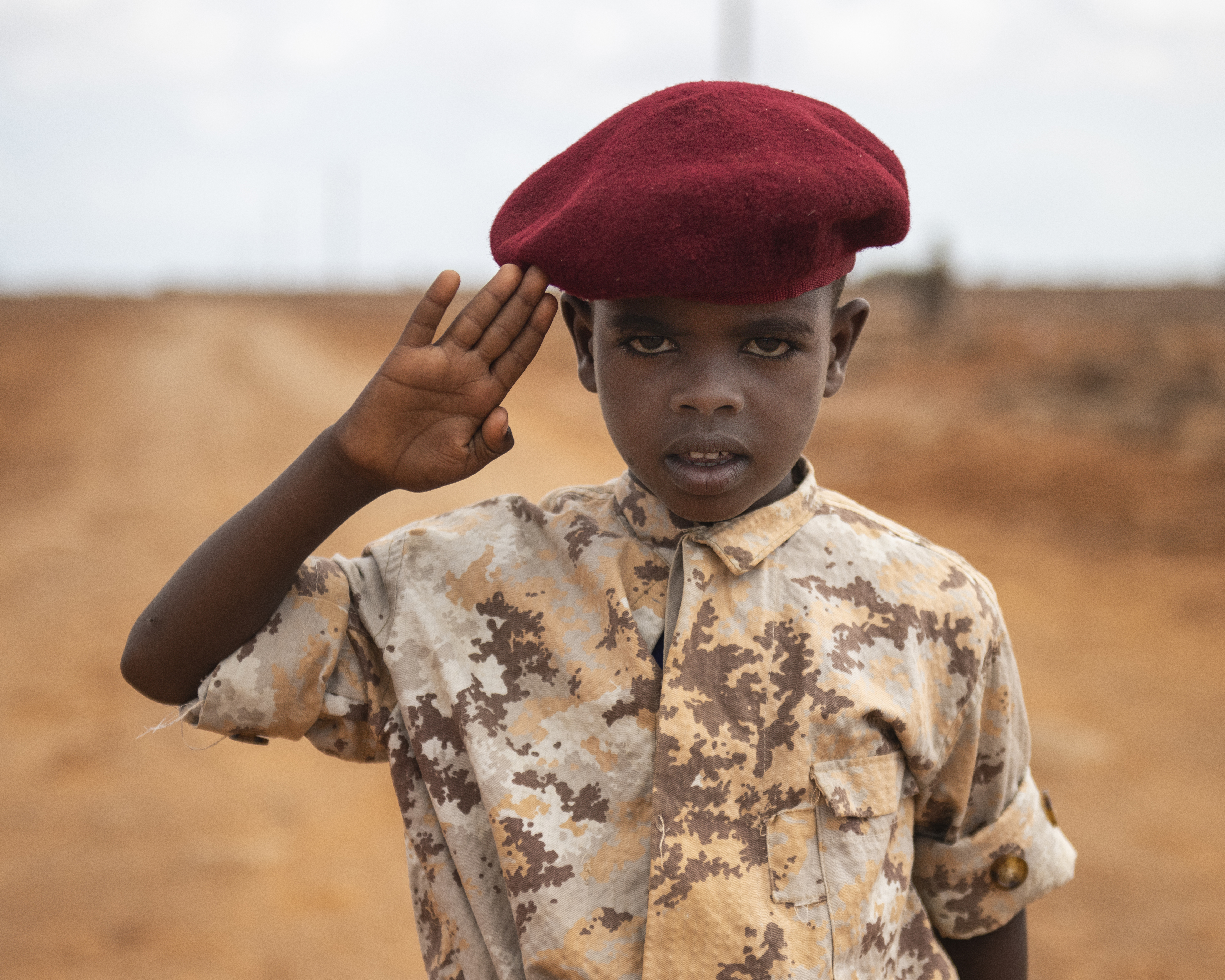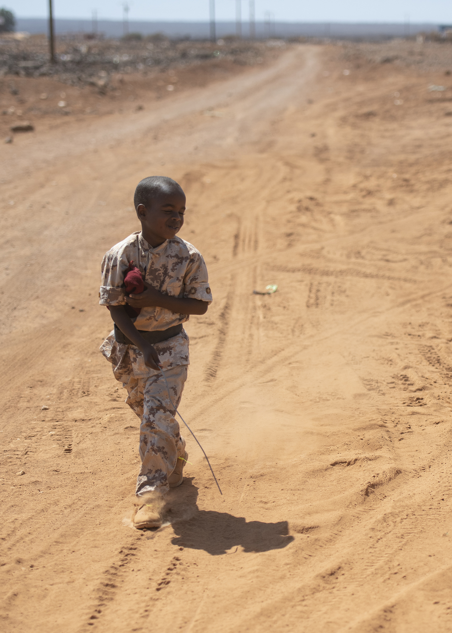 A Djiboutian youth dressed in military-style uniform plays along the road during the Ali Oune Medial Clinic ribbon cutting ceremony in Ali Oune, Djibouti, Jan. 31, 2019. The clinic, which salutes a U.S. Navy Seabee, from Naval Mobile Construction Battalion 1, have been working to complete for five months, is intended to enhance the Ministry of Health for Djibouti’s ability to provide basic medical, birth and after care to the Ali Oune village and its more than 1,000 residents and rural neighbors. (U.S. Air Force photo by Tech. Sgt. Shawn Nickel)