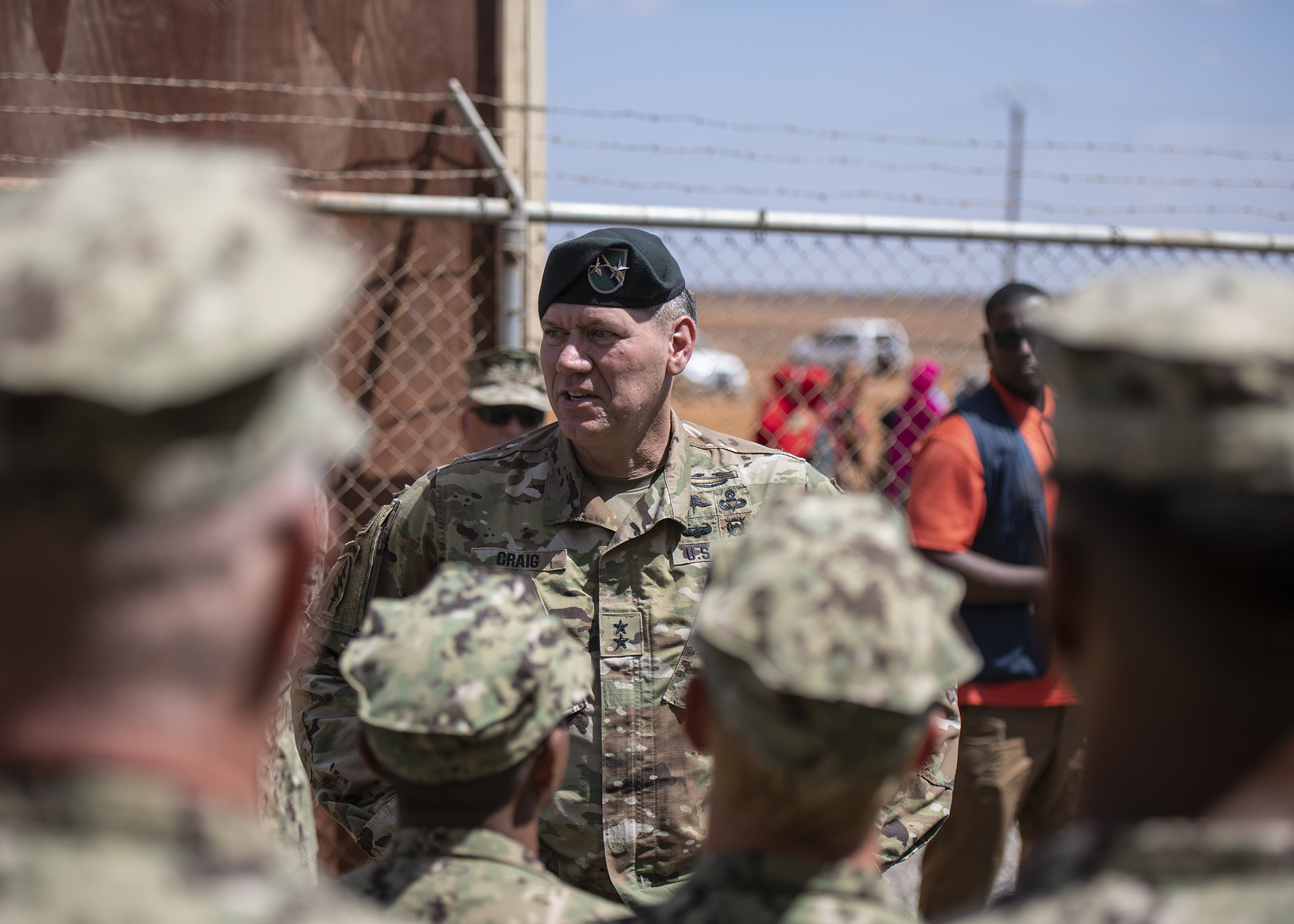 U.S. Army Maj. Gen. James D. Craig, commanding general, Combined Joint Task Force-Horn of Africa (CJTF-HOA), speaks to U.S. Navy Seabees from Naval Mobile Construction Battalion 1, assigned to CJTF-HOA, during the Ali Oune Medial Clinic ribbon cutting ceremony in Ali Oune, Djibouti, Jan. 31, 2019. The clinic, which the Seabees have been working to complete for five months, is intended to enhance the Ministry of Health for Djibouti’s ability to provide basic medical, birth and after care to the Ali Oune village and its more than 1,000 residents and rural neighbors. (U.S. Air Force photo by Tech. Sgt. Shawn Nickel)
