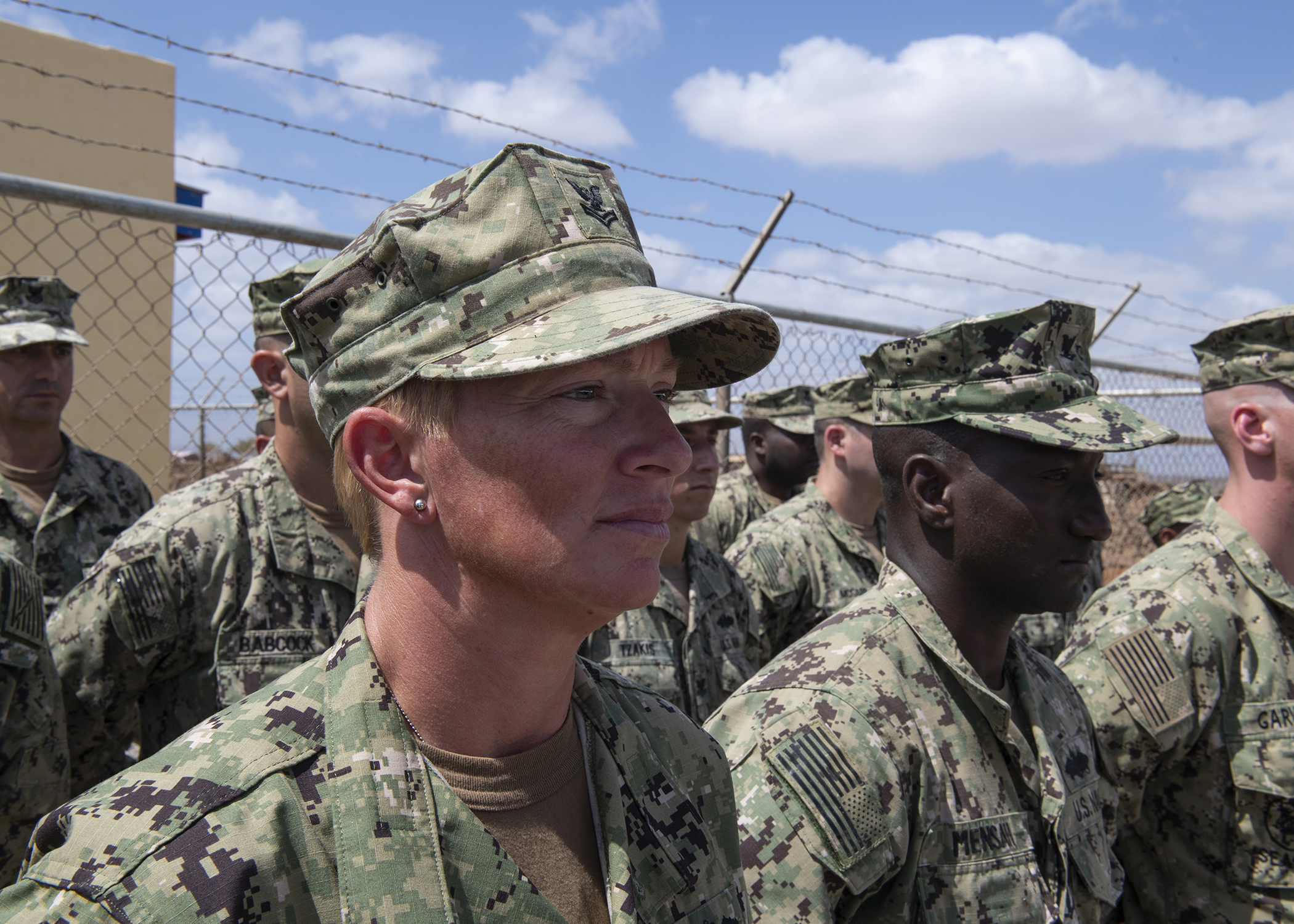U.S. Navy Petty Officer 1st Class Carroll Bennett, a Seabee from Naval Mobile Construction Battalion 1, assigned to Combined Joint Task Force-Horn of Africa, stands in formation during the Ali Oune Medial Clinic ribbon cutting ceremony in Ali Oune, Djibouti, Jan. 31, 2019. The clinic, which the Seabees have worked on for five months, is intended to enhance the Ministry of Health for Djibouti’s ability to provide basic medical, birth and after care to the Ali Oune village and its more than 1,000 residents and rural neighbors. (U.S. Air Force photo by Tech. Sgt. Shawn Nickel)