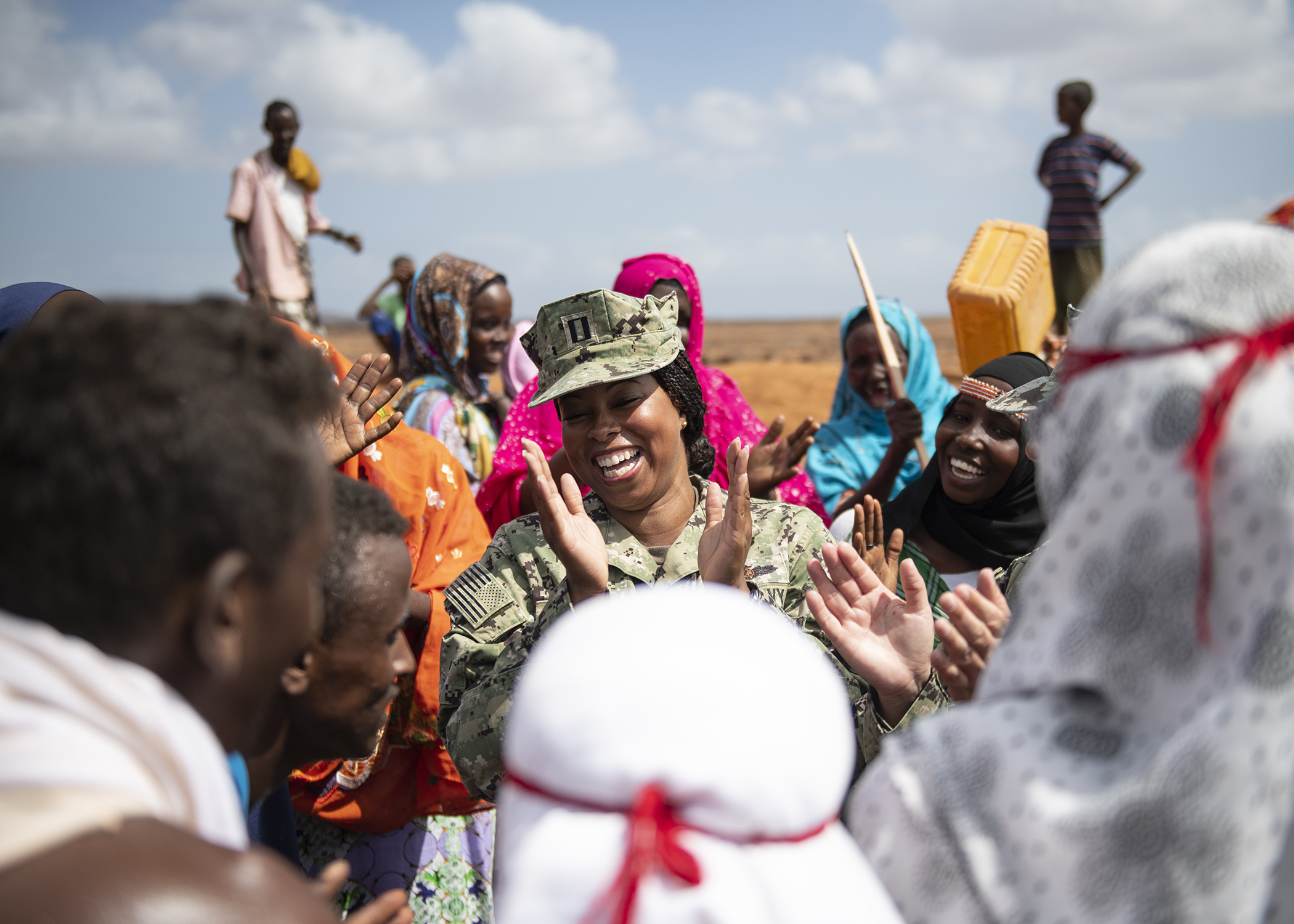 U.S. Navy Lt. Mellany George, an engineering project manager assigned to Combined Joint Task Force-Horn of Africa (CJTF-HOA), laughs as she dances with Djiboutian citizens before the Ali Oune Medial Clinic ribbon cutting ceremony in Ali Oune, Djibouti, Jan. 31, 2019. The clinic, which U.S. Navy Seabees from Naval Mobile Construction Battalion 1, assigned to CJTF-HOA, have been working to complete for five months, is intended to enhance the Ministry of Health for Djibouti’s ability to provide basic medical, birth and after care to the Ali Oune village and its more than 1,000 residents and rural neighbors. (U.S. Air Force photo by Tech. Sgt. Shawn Nickel)