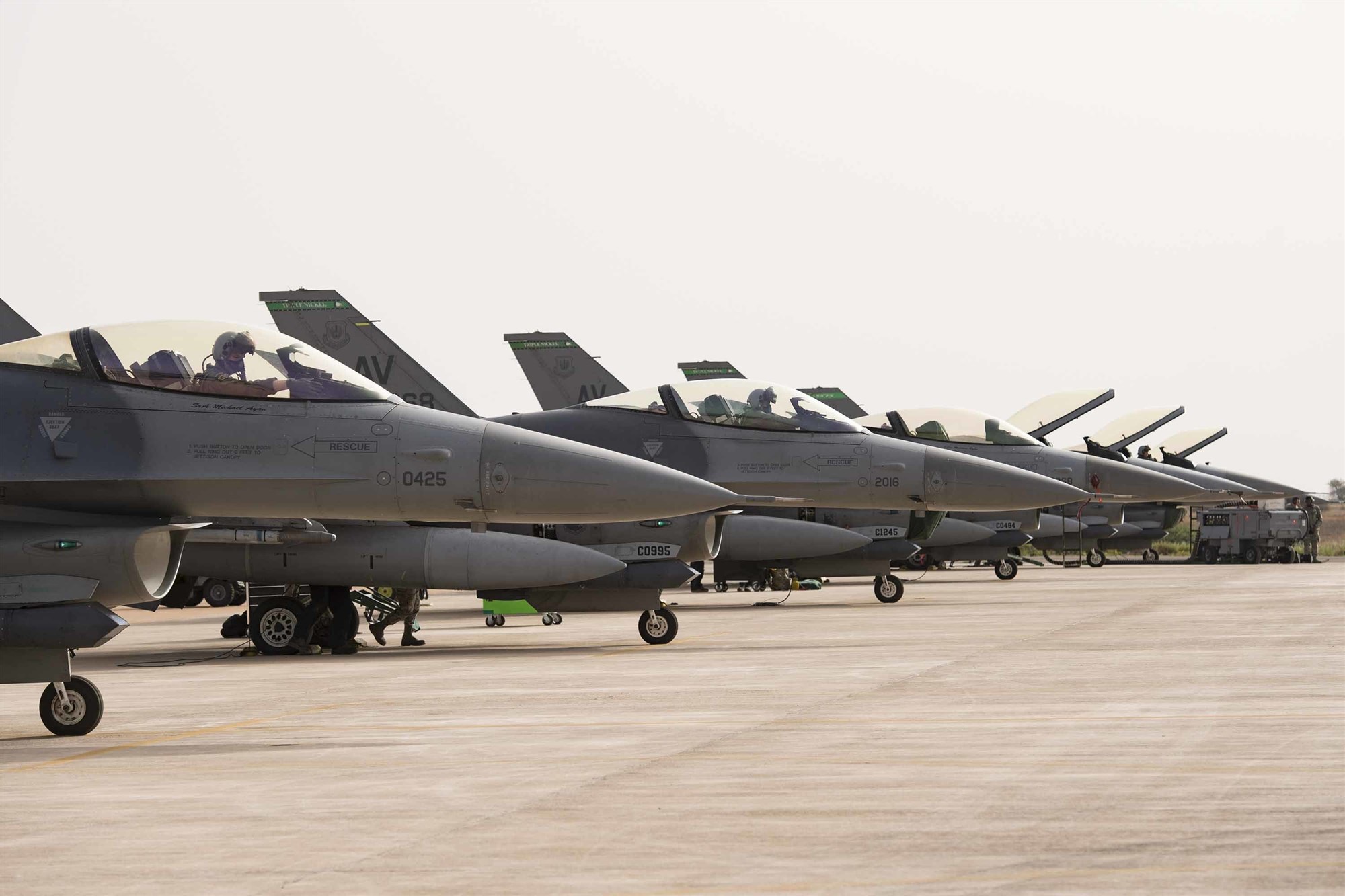 F-16C Fighting Falcons from the 555th Expeditionary Fighter Squadron rest on the flight line during exercise African Lion 2019 at Ben Guerir Air Base, Morocco, March 25, 2019. The squadron deployed out of the 31st Fighter Wing, Avaino Air Base, Italy. African Lion 2019 is a Chairman of the Joint Chiefs of Staff-sponsored, U.S. Africa Command-scheduled, U.S. Marine Corps Forces Europe and Africa-led, joint and combined exercise conducted in the Kingdom of Morocco with a spoke in Tunisia, and armed forces participants in from Canada, France, Senegal, Spain, and the United Kingdom. (U.S. Air Force photo by Staff Sgt. Ceaira Tinsley)