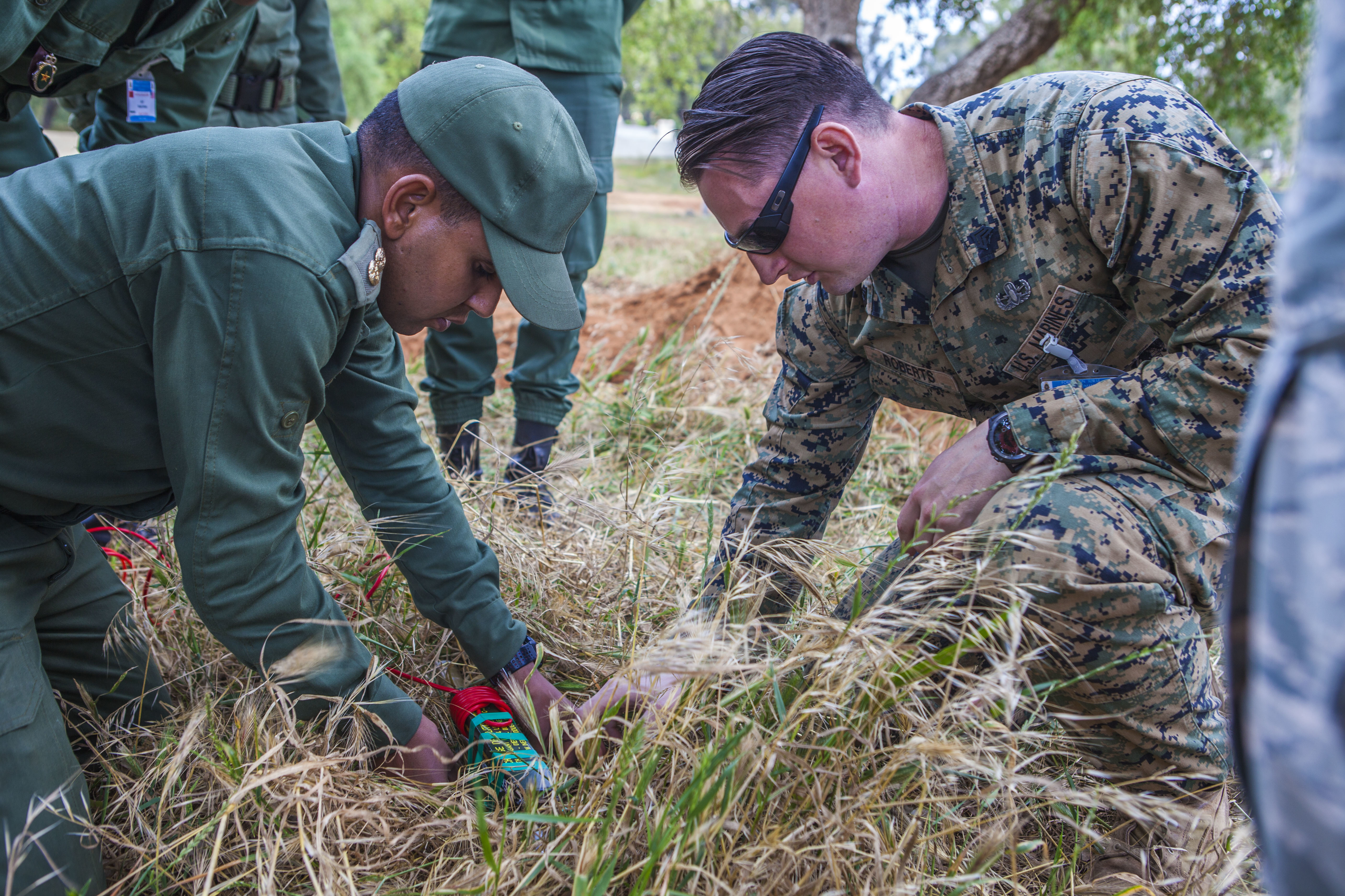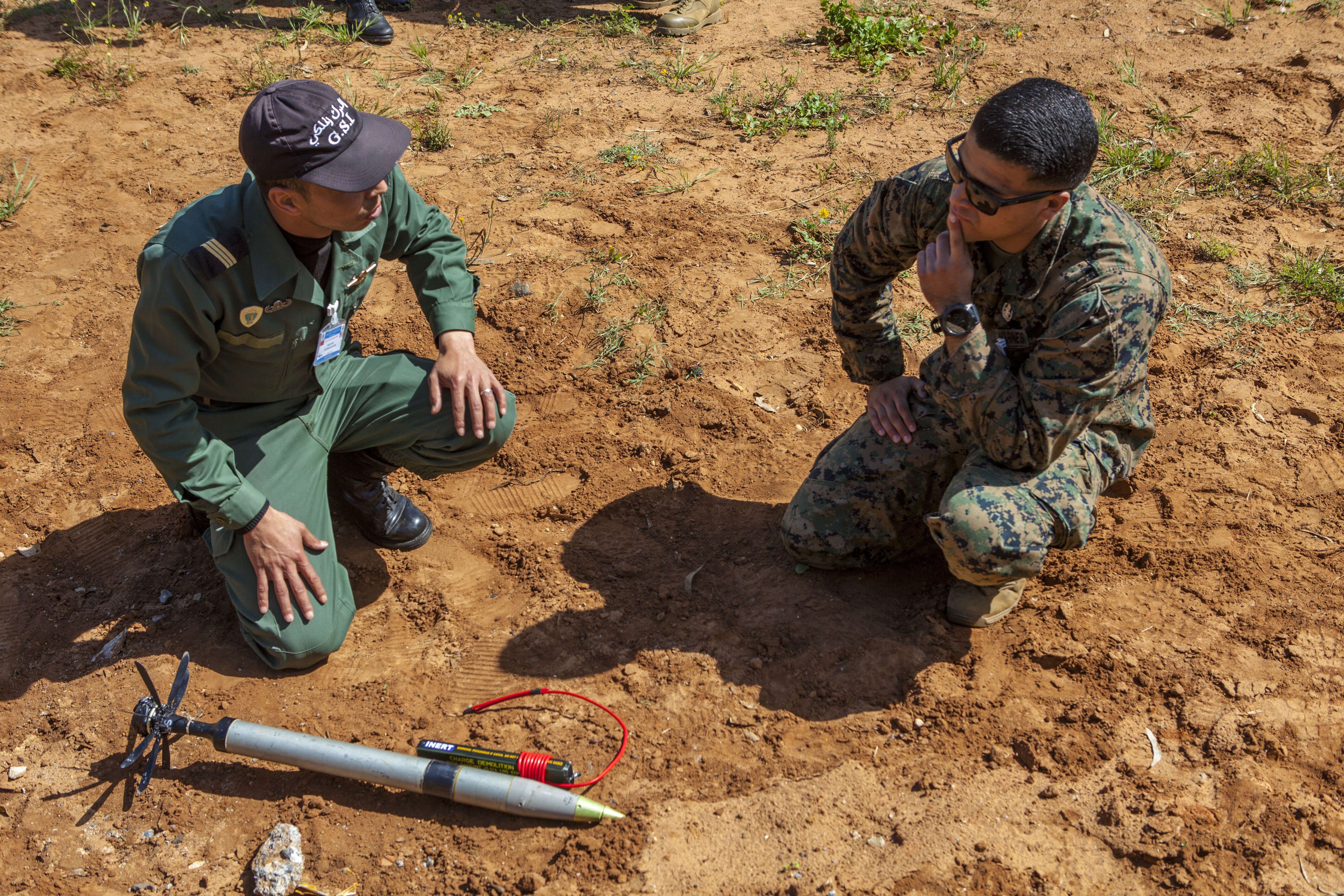 The HMA program is designed to assist allied and partner countries in reducing landmines and explosives that threaten civilian population, according to the U.S. State Department website. In order to further this effort in Morocco, U.S. Marine Corps explosive ordnance disposal technicians and a U.S. Navy corpsman trained alongside the Moroccan Royal Armed Forces for four weeks, instructing their Moroccan partners on proper ordnance disposal techniques and tactical combat casualty care.