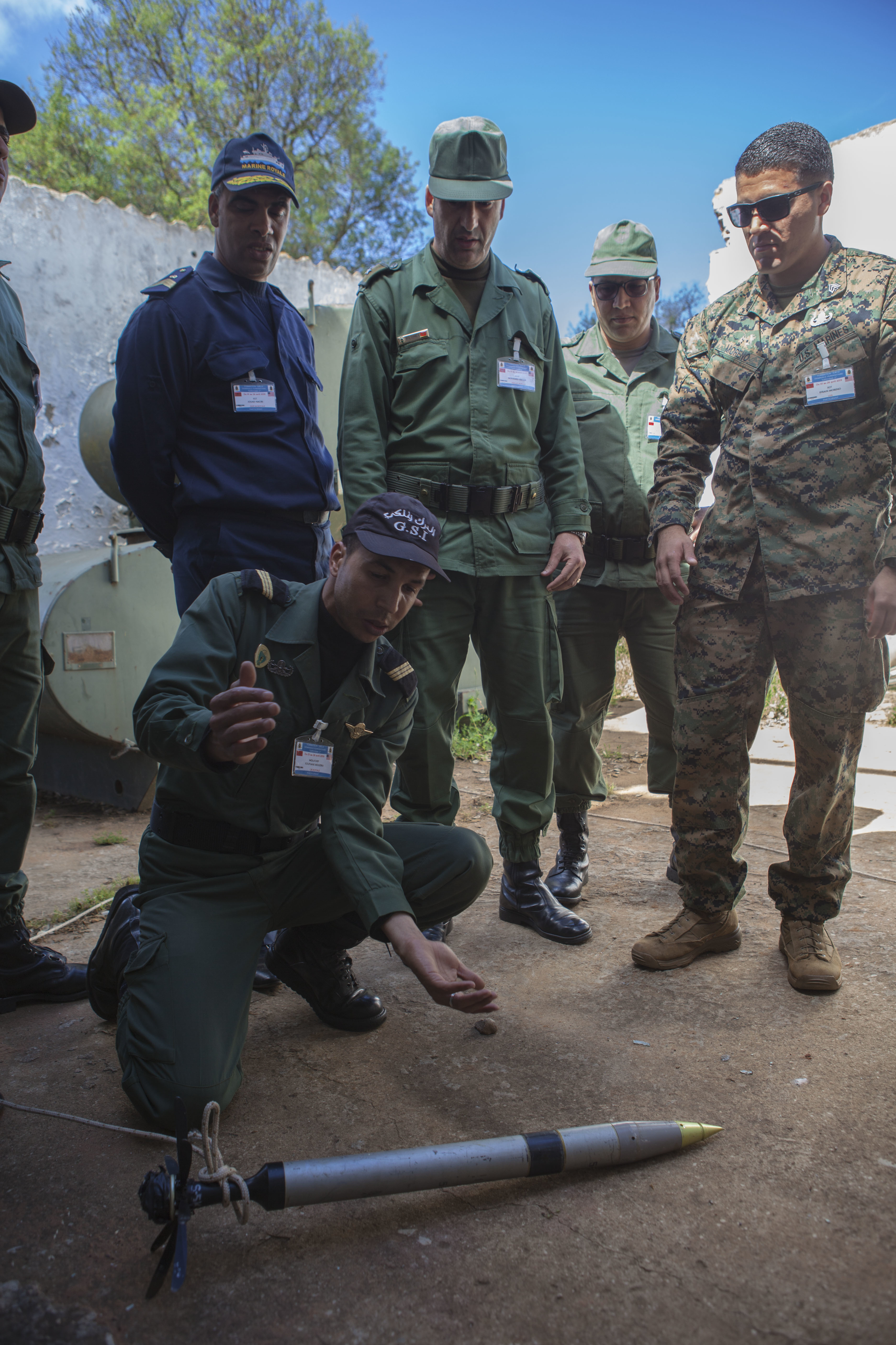 A U.S. Marine with Special Purpose Marine Air-Ground Task Force-Crisis Response-Africa 19.2, Marine Forces Europe and Africa, discusses explosive ordnance disposal procedures with members of the Moroccan Royal Armed Forces during Humanitarian Mine Action training at Unite de Secours et Sauvetage’s Base, Kenitra, Morocco, April 24, 2019. The Moroccan Soldiers trained alongside the U.S. Marines and learned how to identify and properly dispose of explosive ordnance. SPMAGTF-CR-AF is deployed to conduct crisis-response and theater-security operations in Africa and promote regional stability by conducting military-to-military training exercises throughout Europe and Africa. (U.S. Marine Corps photo by Capt. Clay Groover)