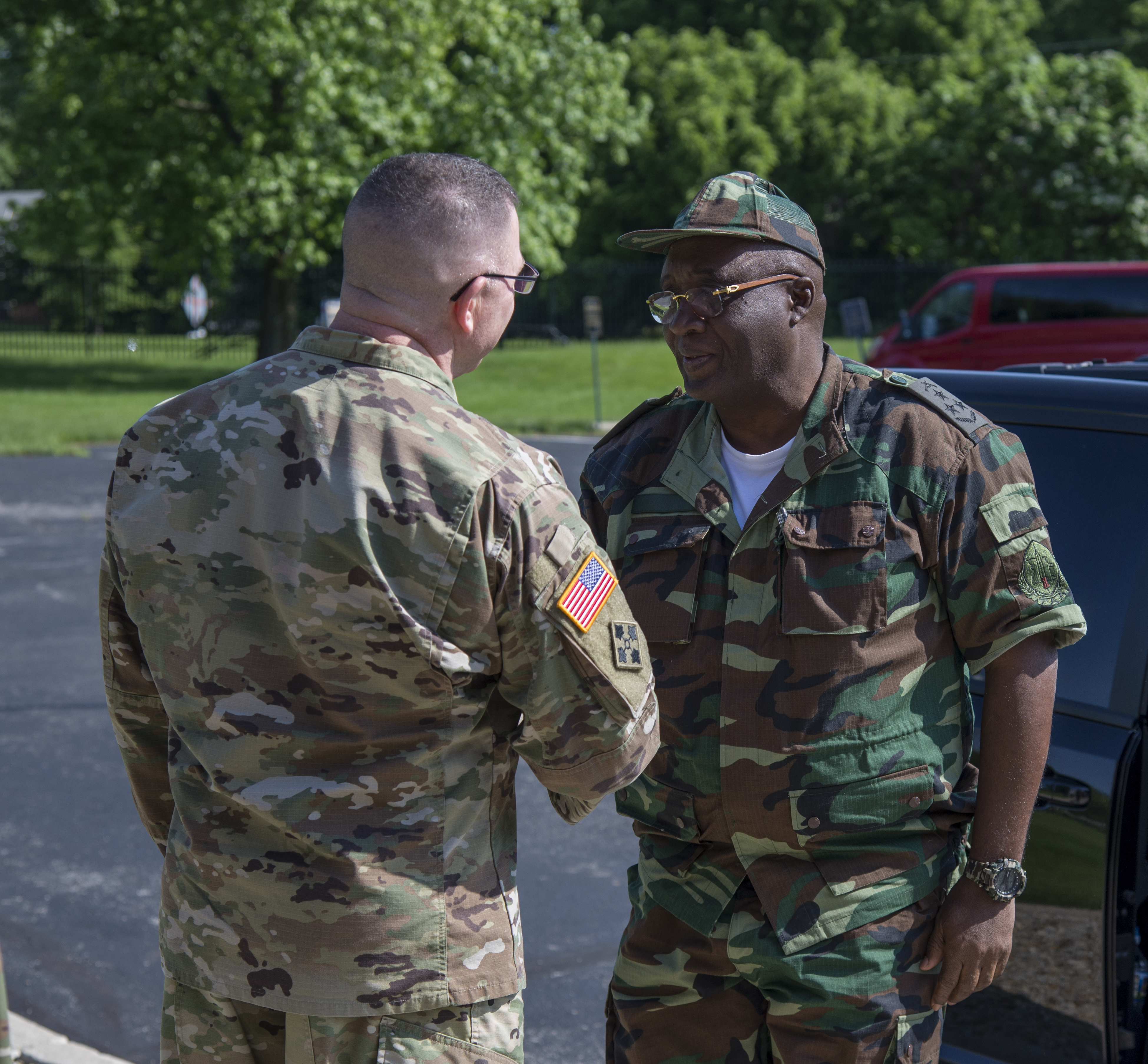 Col. Daniel Shank (left), Ohio assistant adjutant general for Army, greets Gen. Jaques Raul, deputy land forces commander of the Angolan Armed Forces, as his delegation arrives at the Maj. Gen. Robert S. Beightler Armory in Columbus, Ohio, June 4, 2019. The State Partnership Program hosted the delegation at the request of U.S. Army Africa, enabling meetings and discussions between Angolan military and Ohio National Guard leadership.