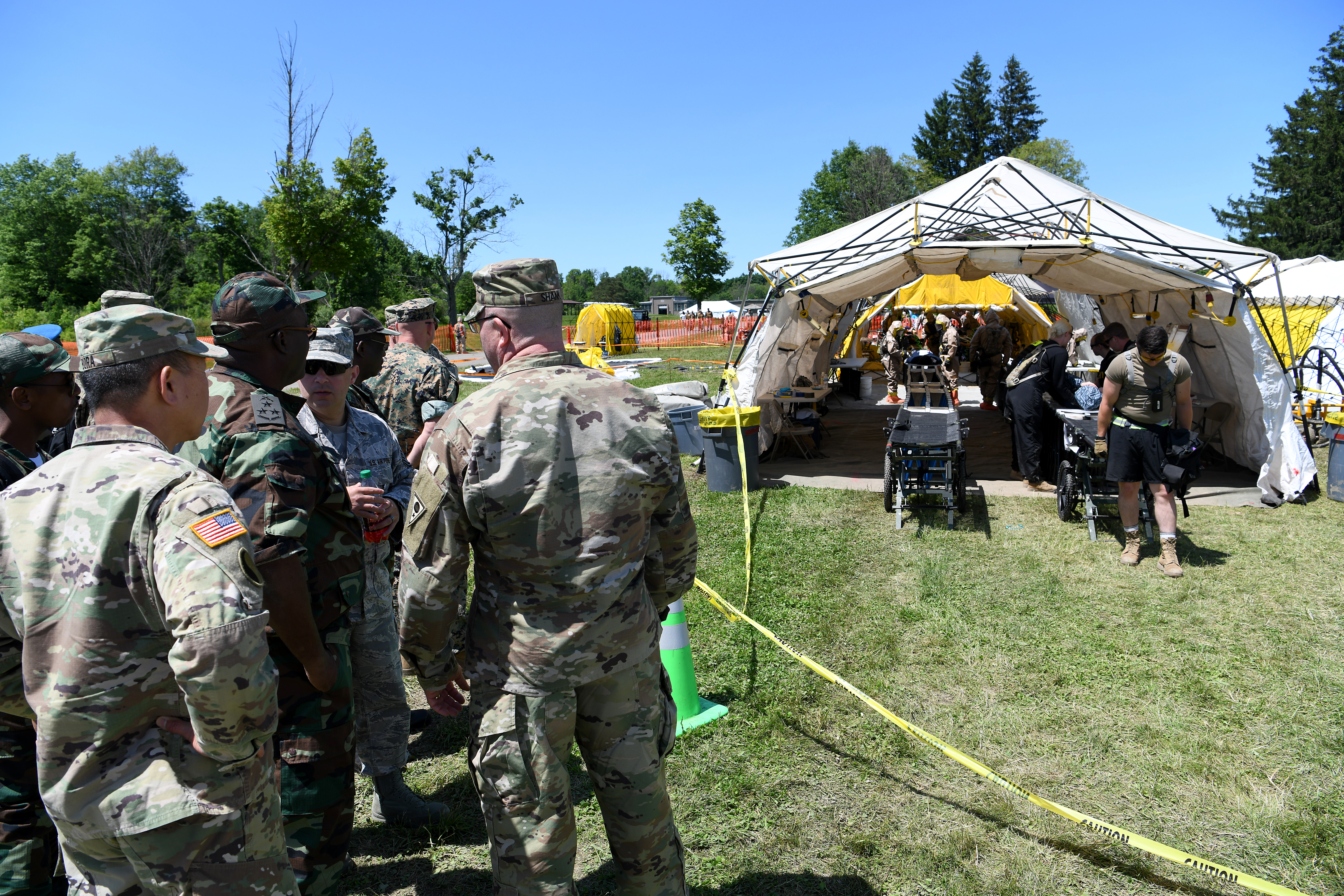 U.S. National Guard members and an Angolan Armed Forces delegation observe the decontamination processing line during an Ohio National Guard Homeland Response Force exercise June 3, 2019, at Camp James A. Garfield Joint Military Training Center near Newton Falls, Ohio. The exercise was a simulated nuclear explosion incident where service members had to work together to rescue victims, decontaminate the area and treat victims’ simulated wounds.