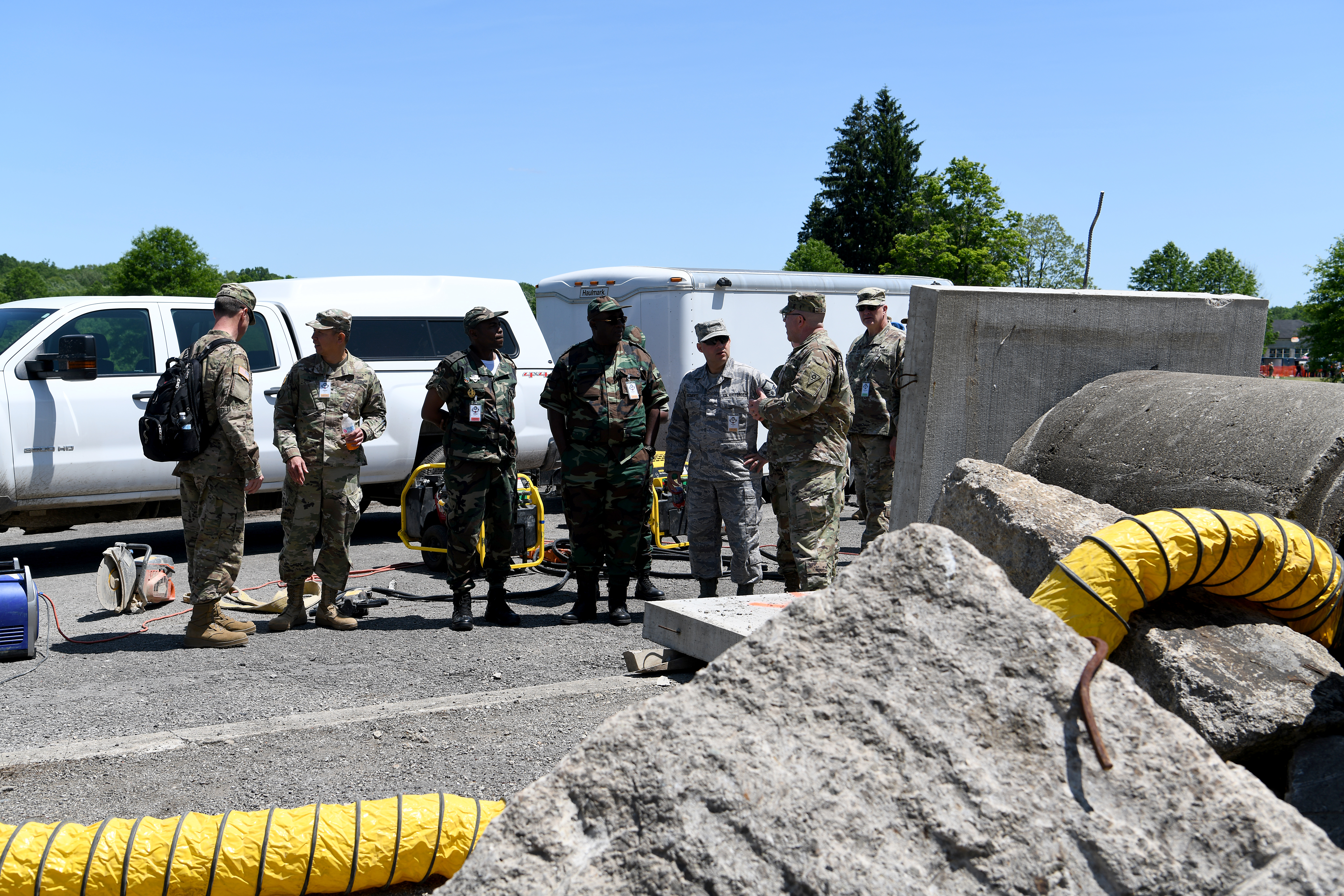U.S. Army Col. Daniel J. Shank (second from right), Ohio assistant adjutant general for Army, explains to Gen. Jaques Raul (center), the Angolan Armed Forces deputy land forces commander, how service members assigned to the Ohio National Guard Homeland Response Force train on rescuing victims out of a rubble pile, June 3, 2019, at Camp James A. Garfield Joint Military Training Center near Newton, Ohio. The OHNG Homeland Response Force, one of only 10 in the nation, showcased to the Angolan delegation some of the unique capabilities of the National Guard when called to respond to natural disasters.