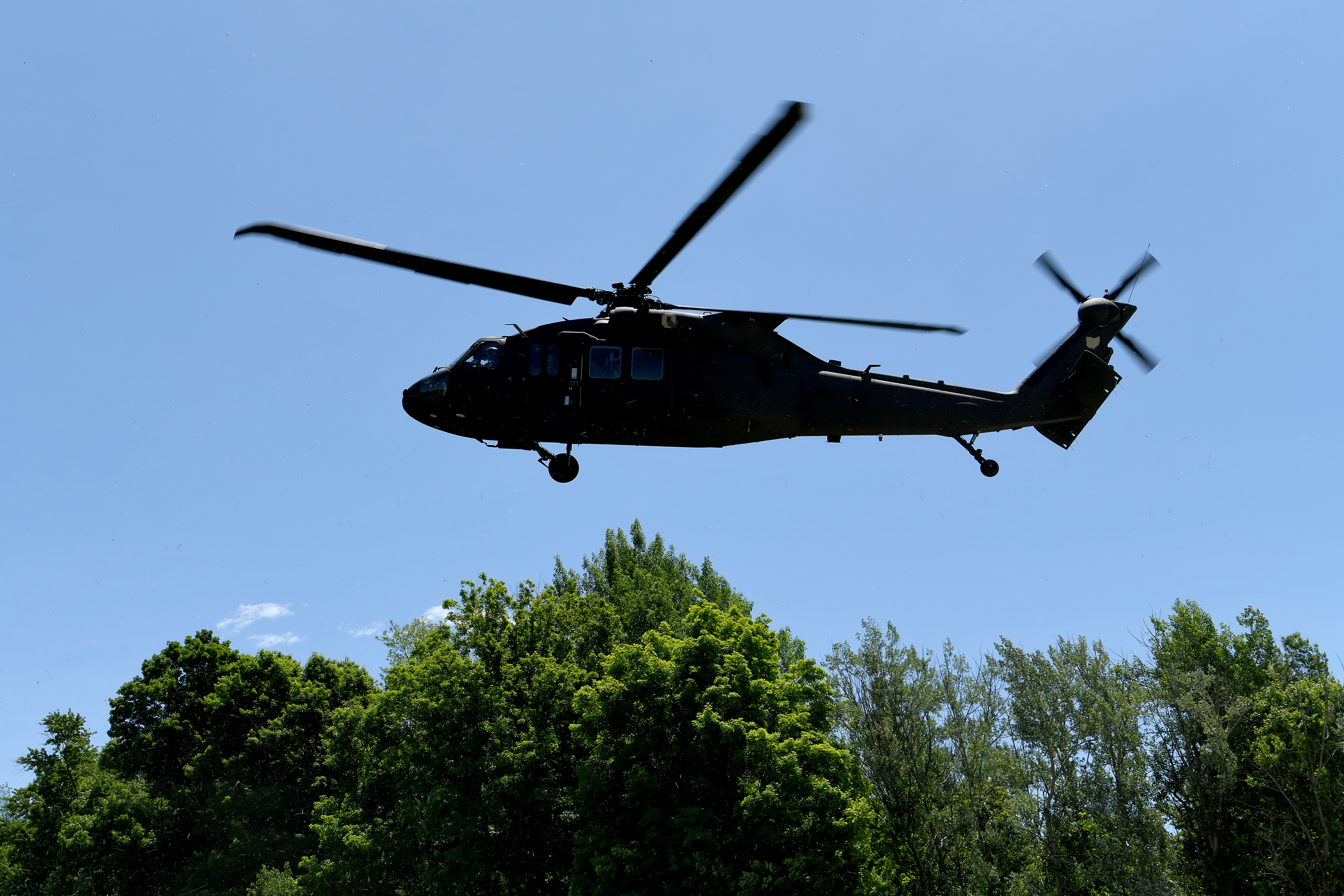 A U.S. Army Black Hawk helicopter carrying members of the Angolan Armed Forces and U.S. National Guard prepares to land June 3, 2019, at Camp James A. Garfield Joint Military Training Center near Newton Falls, Ohio. Angolan Armed Forces members visited Camp Garfield to observe a disaster response and medical exercise conducted by the Ohio National Guard Homeland Response Force.