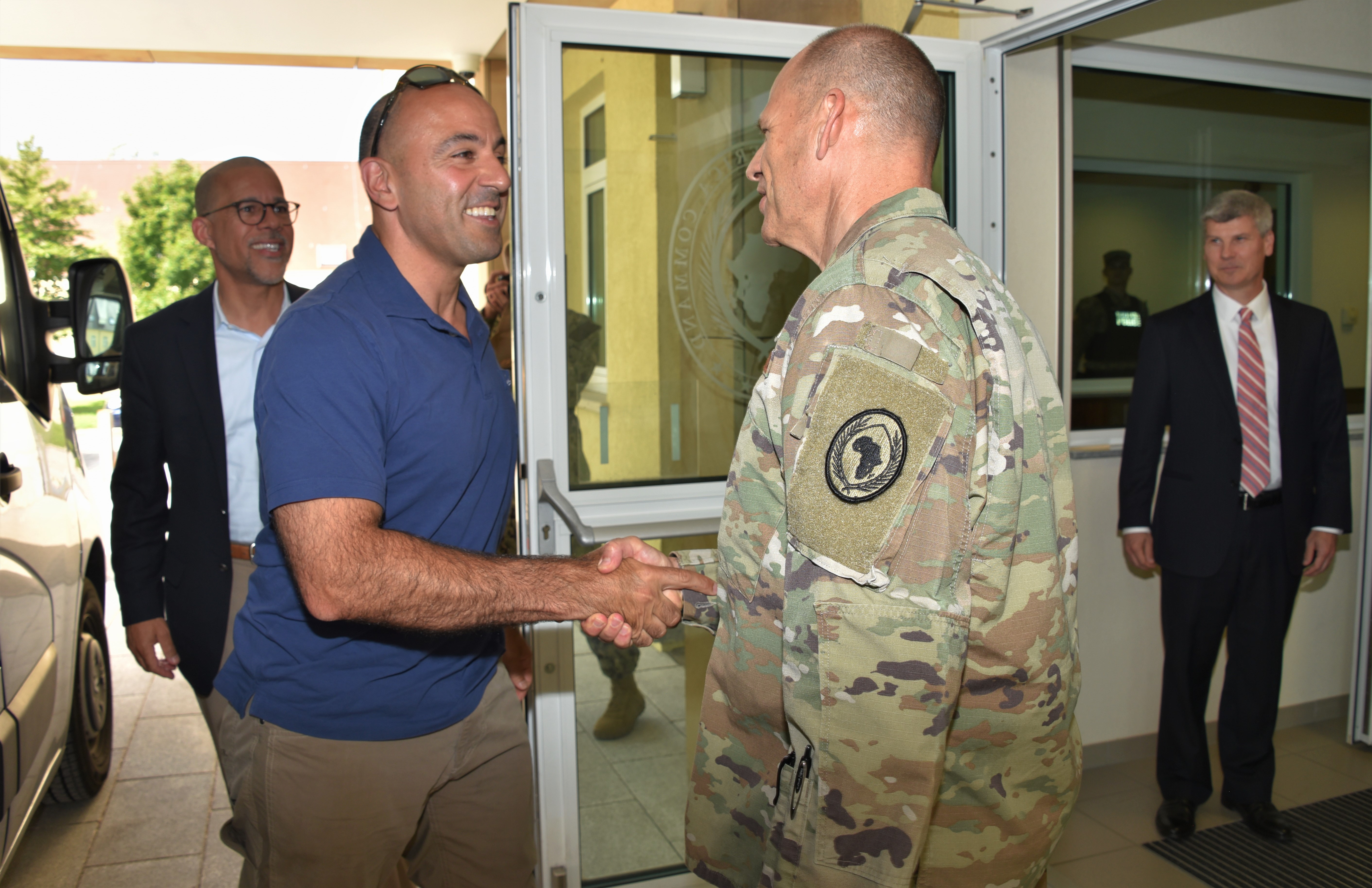 Air Force Lt. Gen. James C. Vechery, AFRICOM deputy to the commander for military operations, greets Congressman Jimmy Panetta (D-CA ) during a congressional delegation visit Aug. 23, 2019 in Stuttgart, Germany. The visit was to gain insight about how the command’s operations and activities support the U.S. strategy for Africa. (U.S. Army photo Takisha Miller/Released)