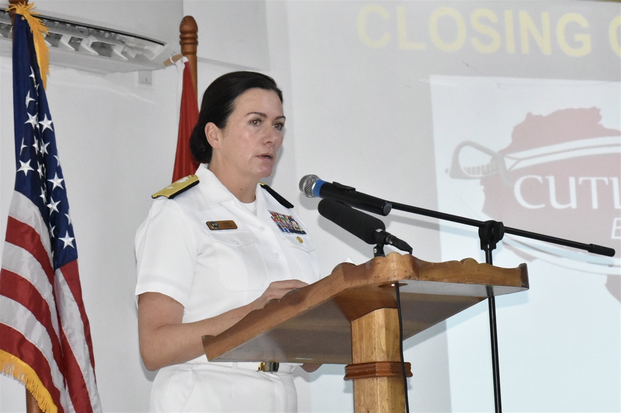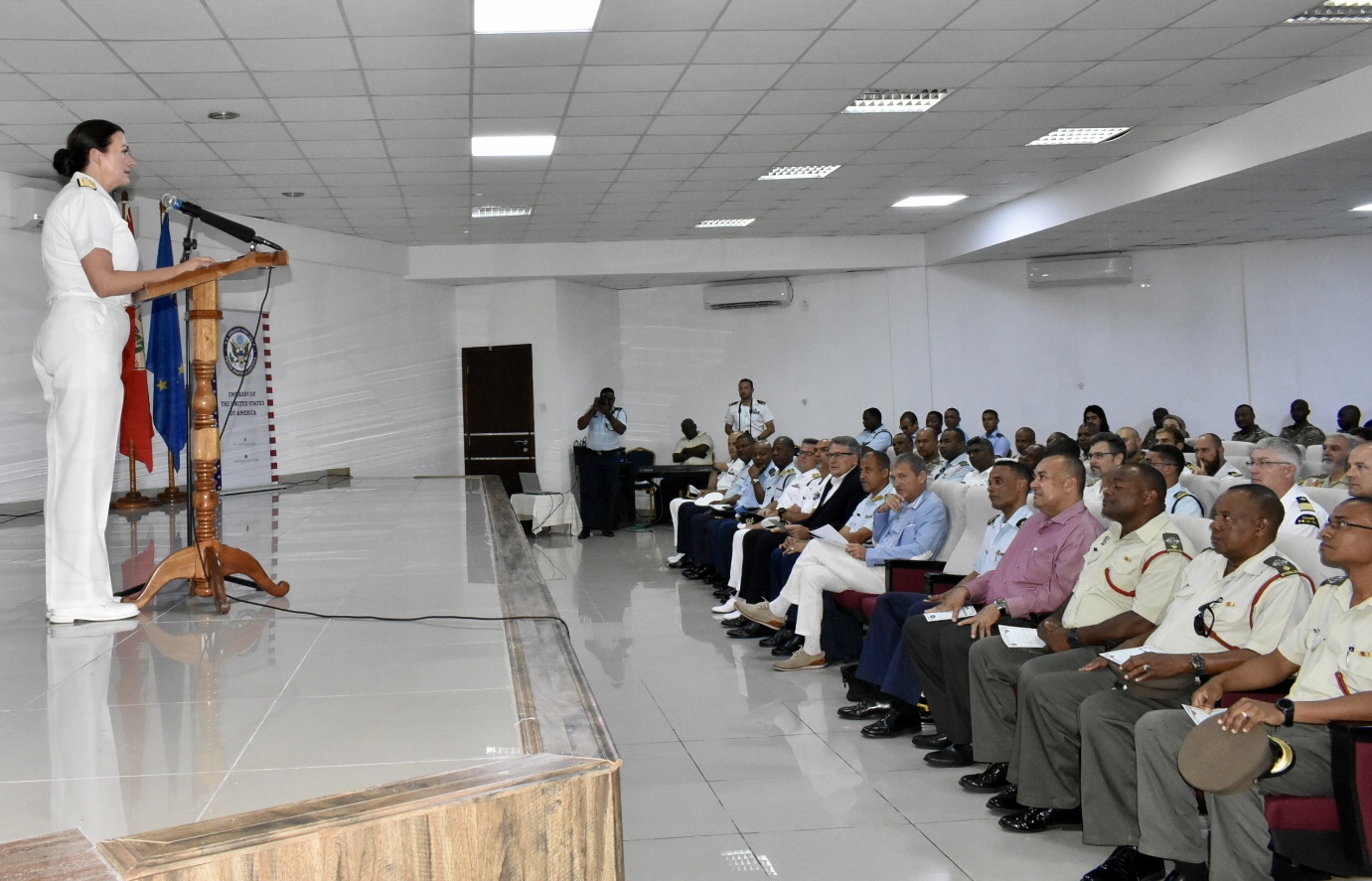 Rear Adm. Nancy Lacore, vice commander, U.S. 6th Fleet and director, Maritime Partnership Program, U.S. Naval Forces Europe-Africa (CNE-CNA), delivers remarks during the closing ceremony of exercise Cutlass Express 19.2 Nov. 16, 2019 in Victoria, Seychelles. CNE-CNA/C6F, headquartered in Naples, Italy, conducts the full spectrum of joint and naval operations, often in concert with allied and interagency partners in order to advance U.S. national interests and security and stability in Europe and Africa.