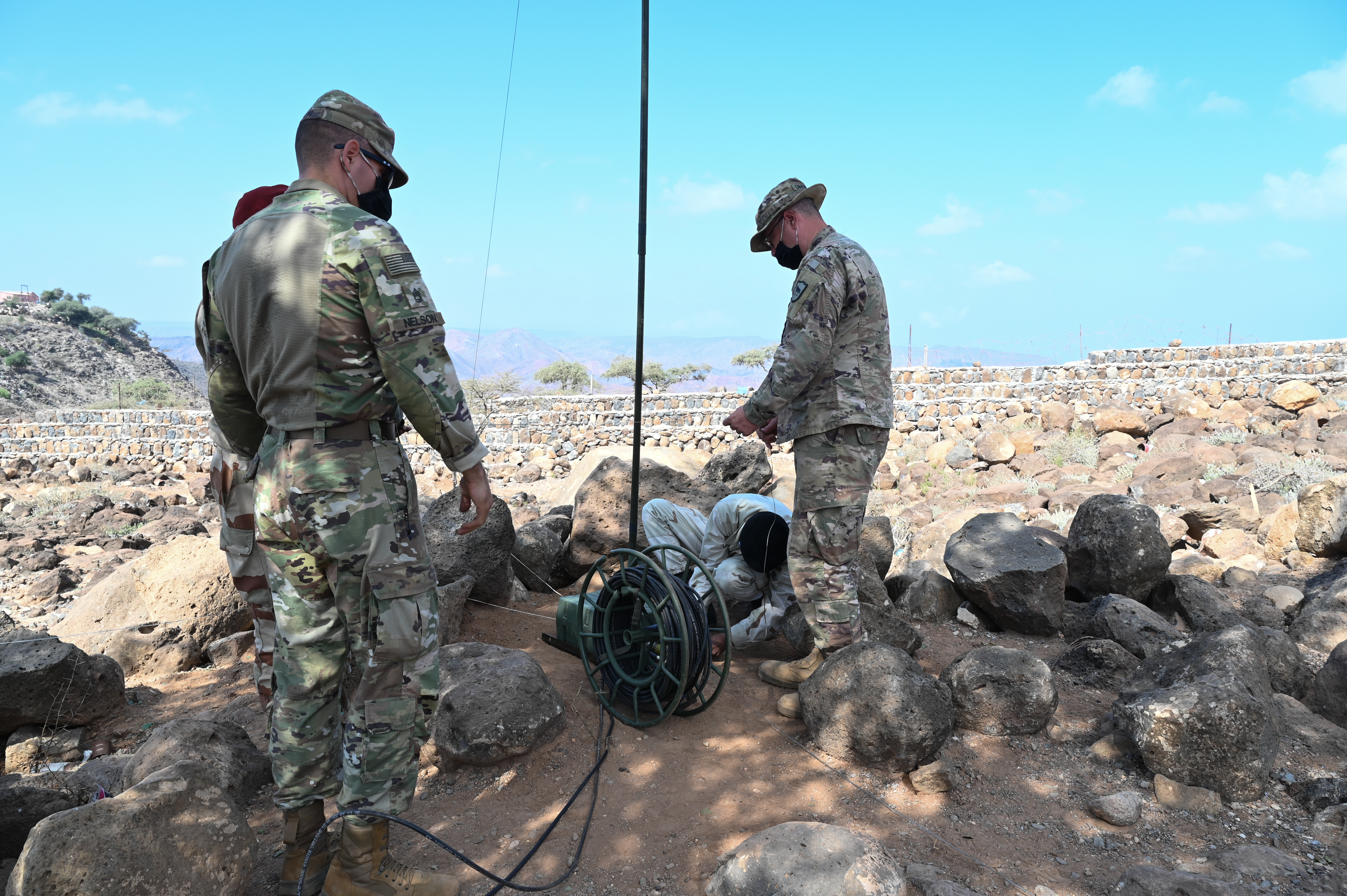 U.S. Soldiers assigned to Combined Joint Task Force-Horn of Africa (CJTF-HOA) Communications Directorate, CJ-6, train alongside Armed Forces of Djibouti (FAD) during a military-to-military exchange of signal communications practices in a field exercise at Arta, Djibouti, March 15 - 18, 2021.