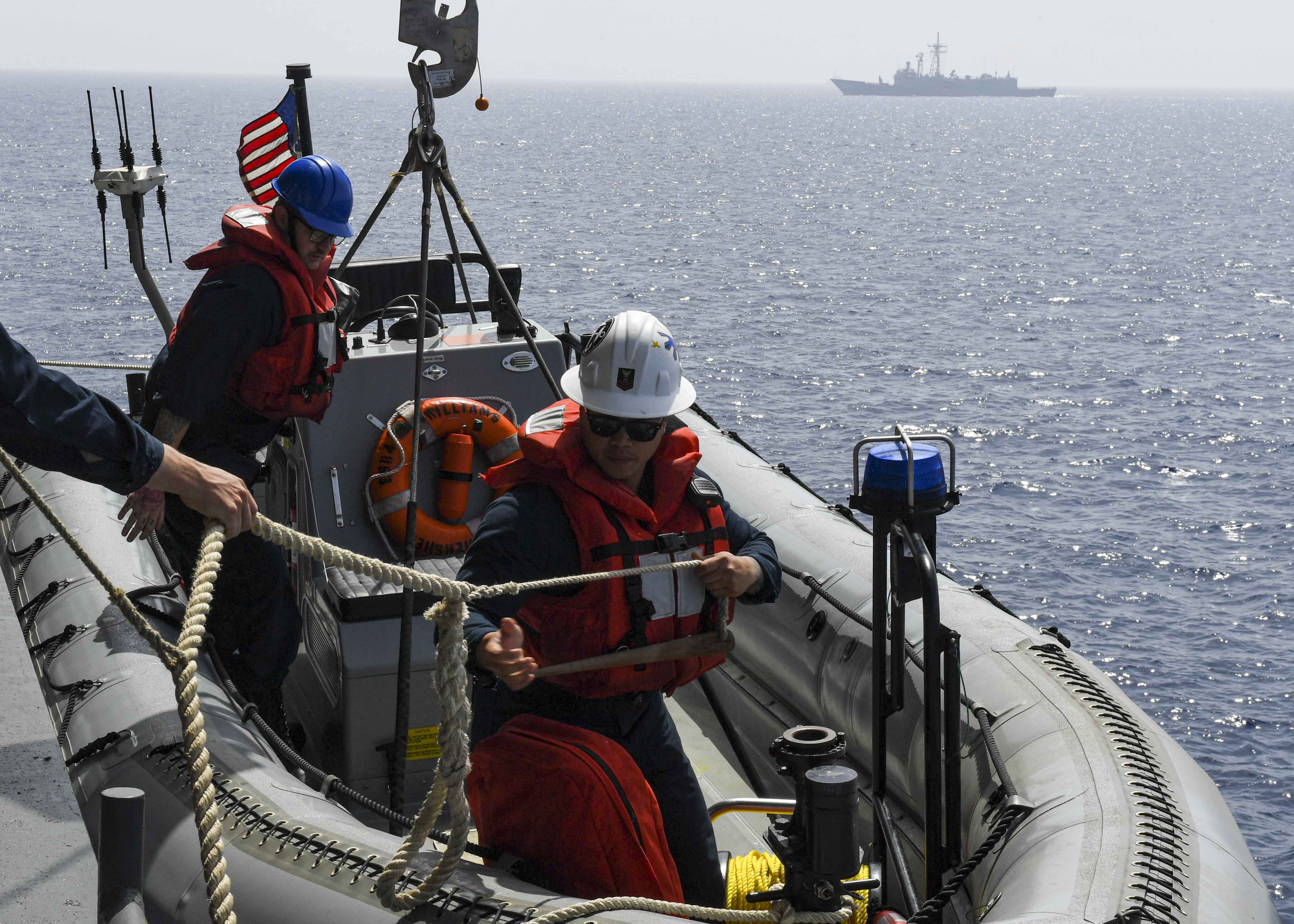 MEDITERRANEAN SEA (May 23, 2021) Boatswain’s Mate 2nd Class Bodee Coffman prepares to launch a rigid hulled inflatable boat (RHIB) as they begin to participate in Exercise Phoenix Express 2021 aboard the Expeditionary Sea Base USS Hershel “Woody” Williams (ESB 4) in the Mediterranean Sea, May 23, 2021. Exercise Phoenix Express 2021, conducted by U.S. Naval Forces Africa, is an at-sea maritime exercise designed to improve cooperation among participating nations in order to increase maritime safety and security in the Mediterranean. (U.S. Navy photo by Mass Communication Specialist 2nd Class Eric Coffer/Released)