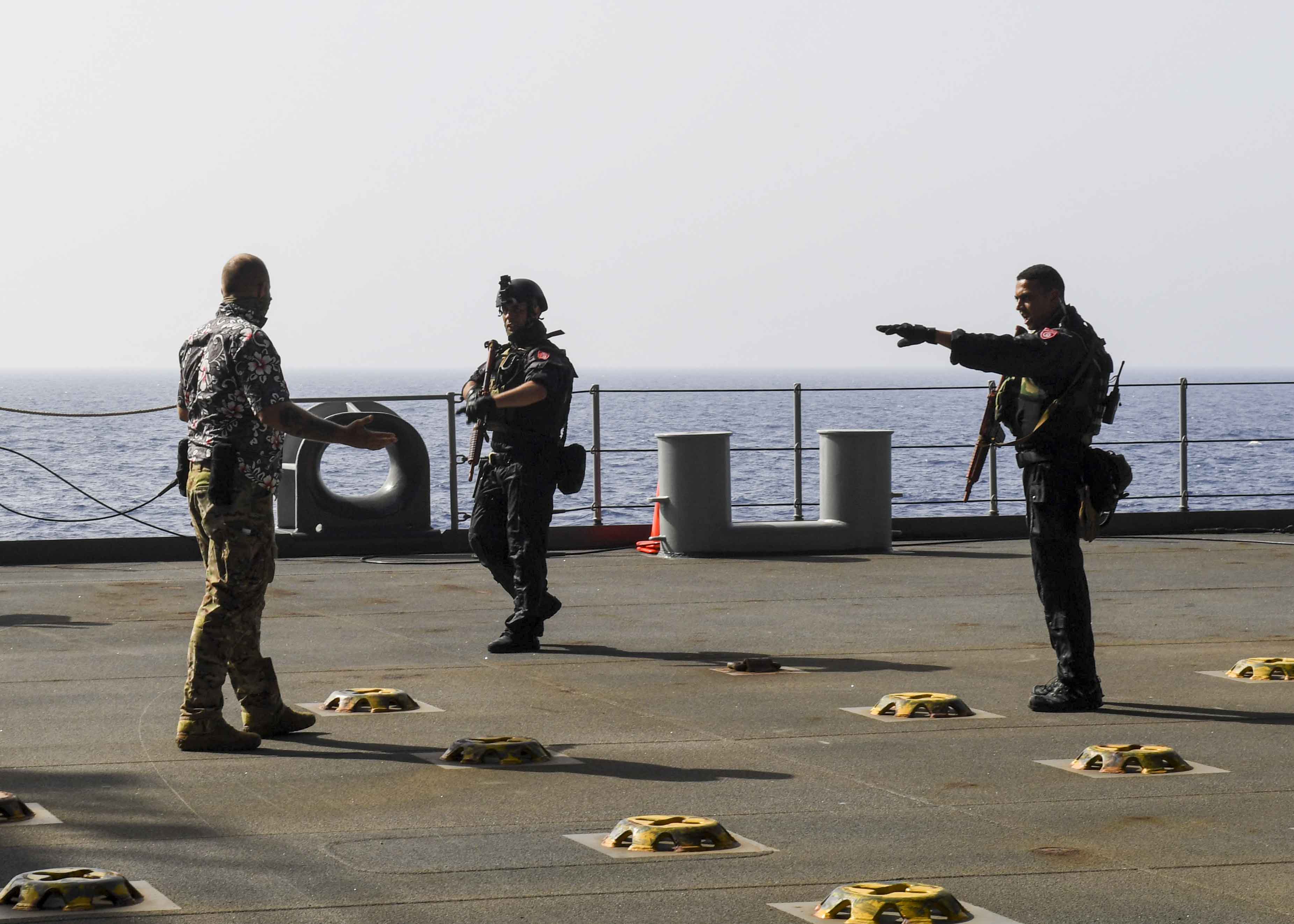 MEDITERRANEAN SEA (May 23, 2021) Members of the Tunisian navy visit, board, search and seizure team practice securing simulated hostile mariners while participating in Exercise Phoenix Express 2021 aboard the Expeditionary Sea Base USS Hershel “Woody” Williams (ESB 4) in the Mediterranean Sea, May 23, 2021. Exercise Phoenix Express 2021, conducted by U.S. Naval Forces Africa, is an at-sea maritime exercise designed to improve cooperation among participating nations in order to increase maritime safety and security in the Mediterranean. (U.S. Navy photo by Mass Communication Specialist 2nd Class Eric Coffer/Released)