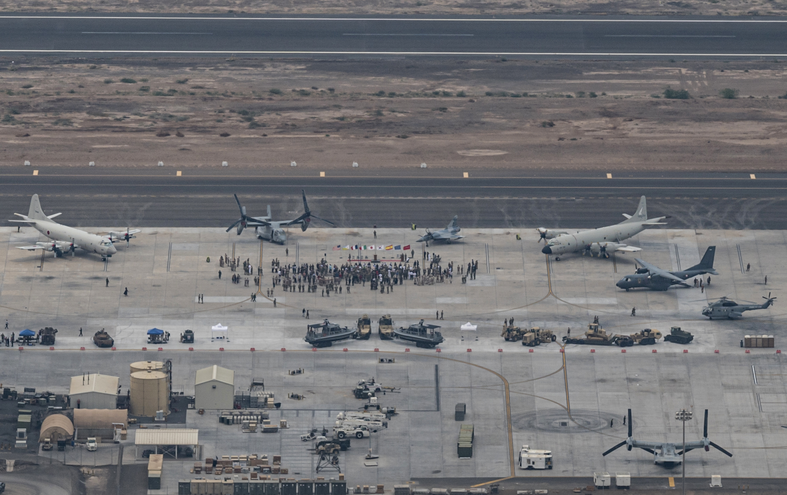U.S. and coalition service members participate in the Combined Joint Task Force - Horn of Africa Partner Appreciation Day 2022 event at Camp Lemonnier, Djibouti, on Nov. 10, 2022. The event celebrated the 20th anniversary of the arrival of U.S. service members in Djibouti after the terrorist attacks of 9/11.