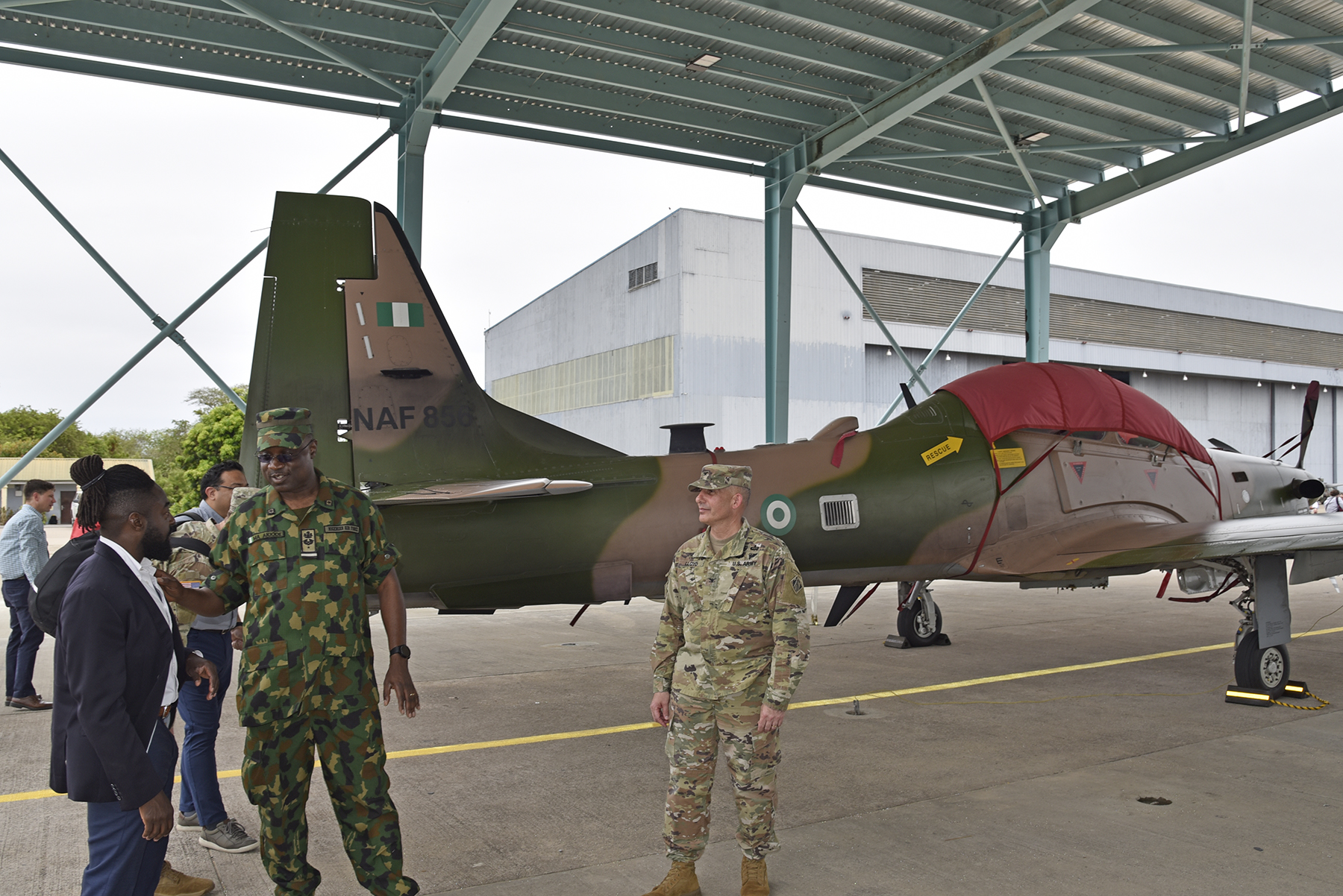 U.S. Chargé d’Affaires for Nigeria David Greene, Director of the U.S. Air Force Security Assistance and Cooperation Directorate Brig. Gen. Joel Safranek, U.S. Army Corps of Engineers, North Atlantic Division Commander Col. John Lloyd, and other U.S. officials joined Amao and other Nigerian Air Force partners to celebrate the completion of the final phase of the construction program for A-29 Super Tucano support facilities.