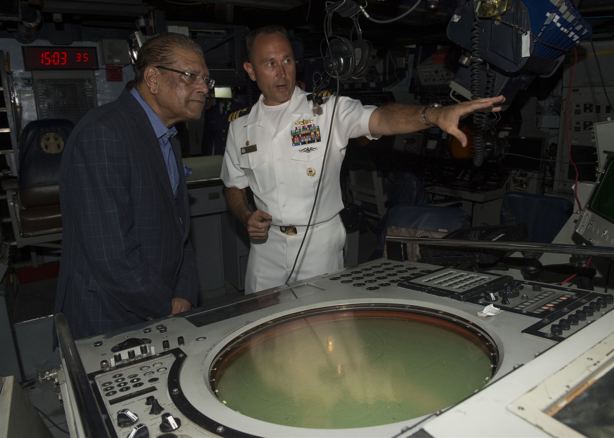 Cmdr. Ken Anderson, USS Simpson (FFG 56) commanding officer, gives a guided tour of his ship to Mauritius President Kailash Purryag. Purryag visited Simpson while it is in Port Louis, Mauritius, taking part in Exercise Cutlass Express 2015. This exercise, sponsored by U.S. Africa Command, is designed to improve regional cooperation, maritime domain awareness and information sharing practices to increase capabilities of East African and Indian Ocean nations to counter sea-based illicit activity. (U.S. Navy photo by Mass Communication Specialist 1st Class David R. Krigbaum/Released)