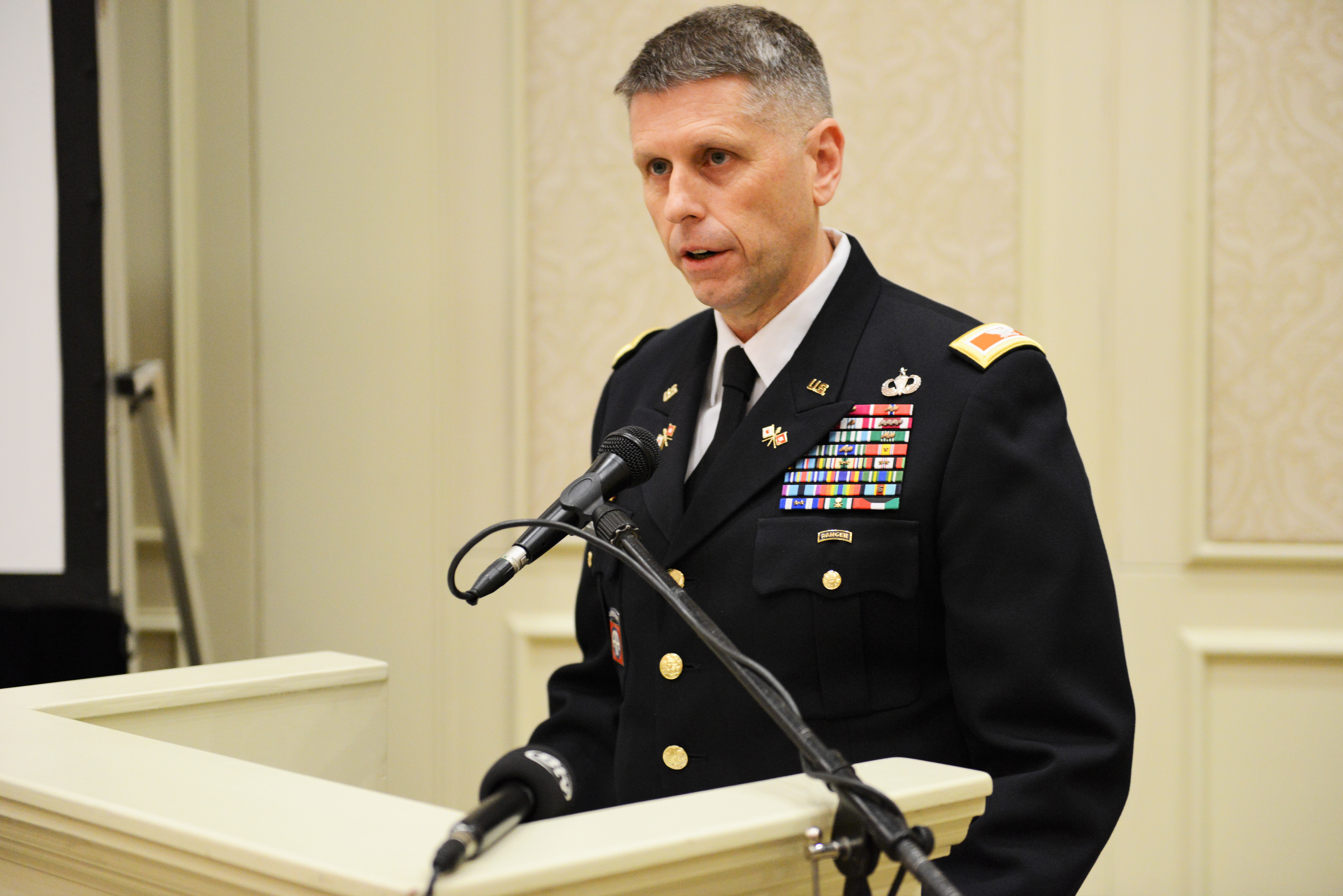 U.S. Army Col. Patrick Dedham, director of communications for U.S. Africa Command, speaks during the opening ceremony of Africa Endeavor 2015 in Gaborone, Botswana, Aug. 24, 2015. More than 1,800 communications specialists from 40 countries, six African regional organizations and six international partner nations have participated in past Africa Endeavor events.