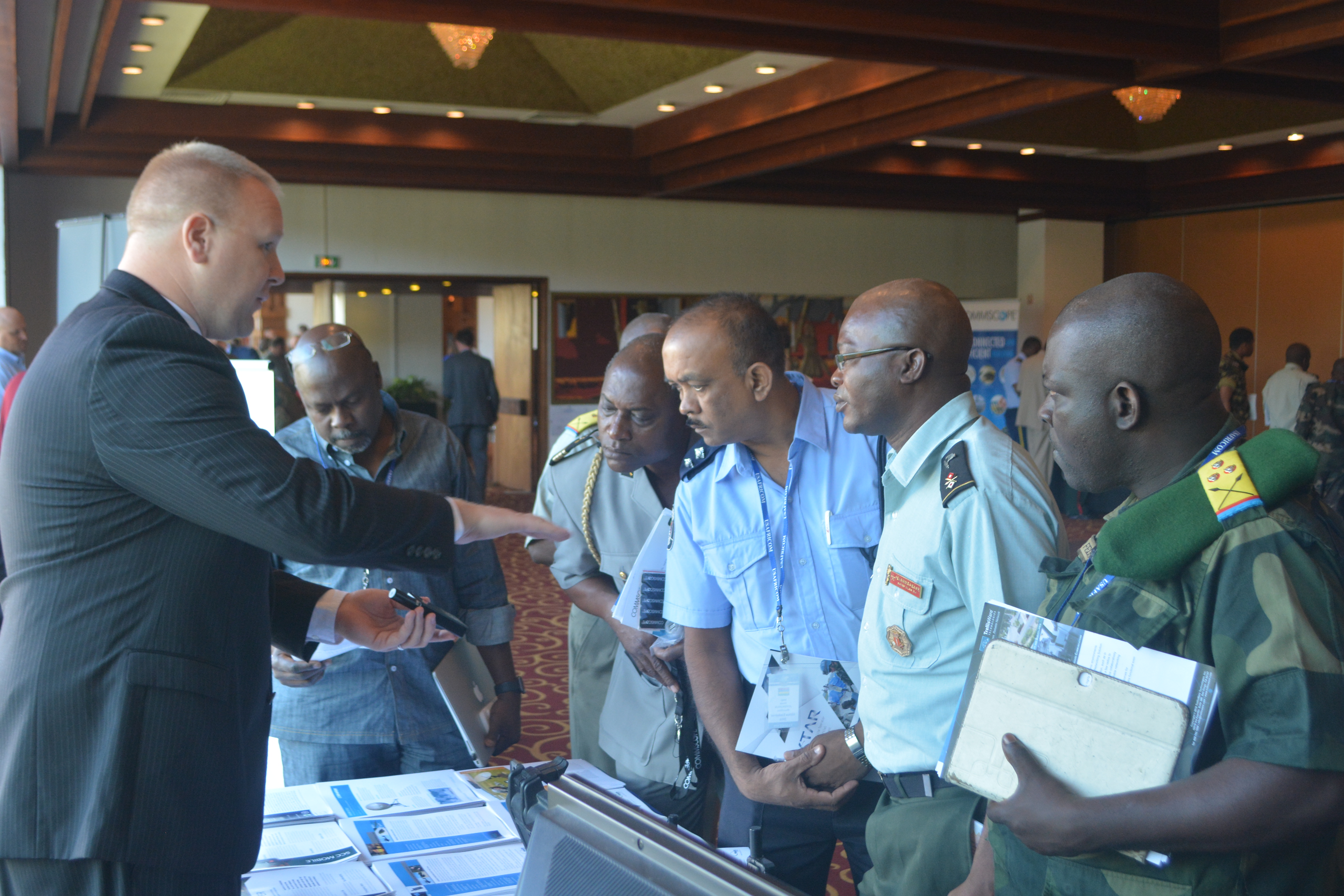 Africa Endeavor 16 participants listen to a technology expo representative talk about various Command, Control, Communications and Computer Systems (C4) solutions 18 Aug., 2016. AE16 is an annual U.S. Africa Command sponsored training and information sharing effort to help develop African multi-national communication interoperability for African Union and United Nations mandated peacekeeping and disaster response in Africa. Over 40 African nations participated in this year's events