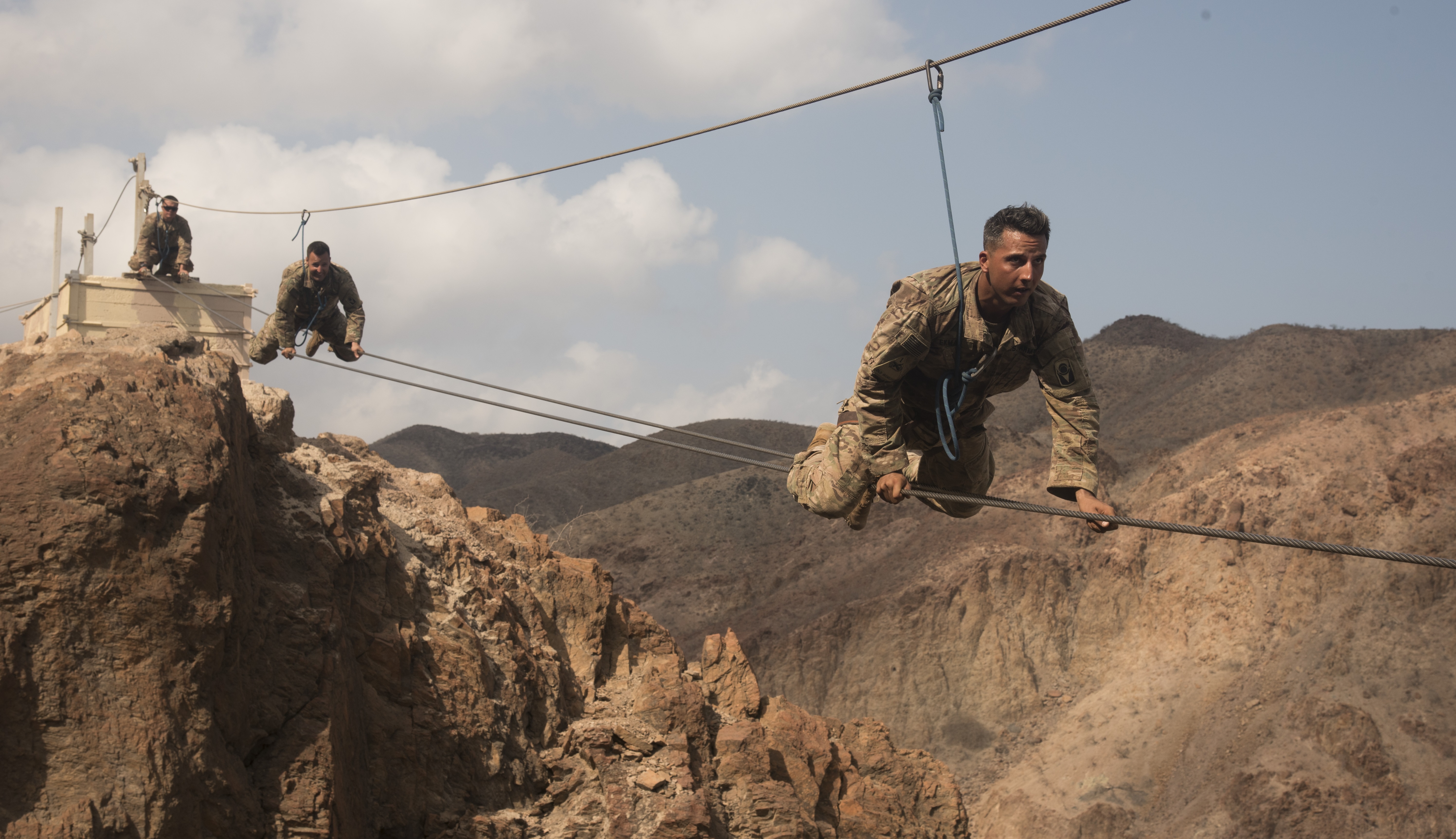 ARTA PLAGE, Djibouti – U.S. Army Soldiers from the 1st Battalion, 124th Infantry Regiment, assigned to Combined Joint Task Force-Horn of Africa, make their way across a portion of the mountain obstacle course, as part of the final day of the French Marines Desert Survival Course, Oct. 10, 2016, at Arta Plage, Djibouti. Approximately 46 U.S. Army Soldiers with French Marines completed several tasks during the survival course, including desert operations, combat lifesaving skills, weapons training, survival cooking, how to decontaminate water, and water and mountain obstacle courses. (U.S. Air Force photo by Staff Sgt. Tiffany DeNault)