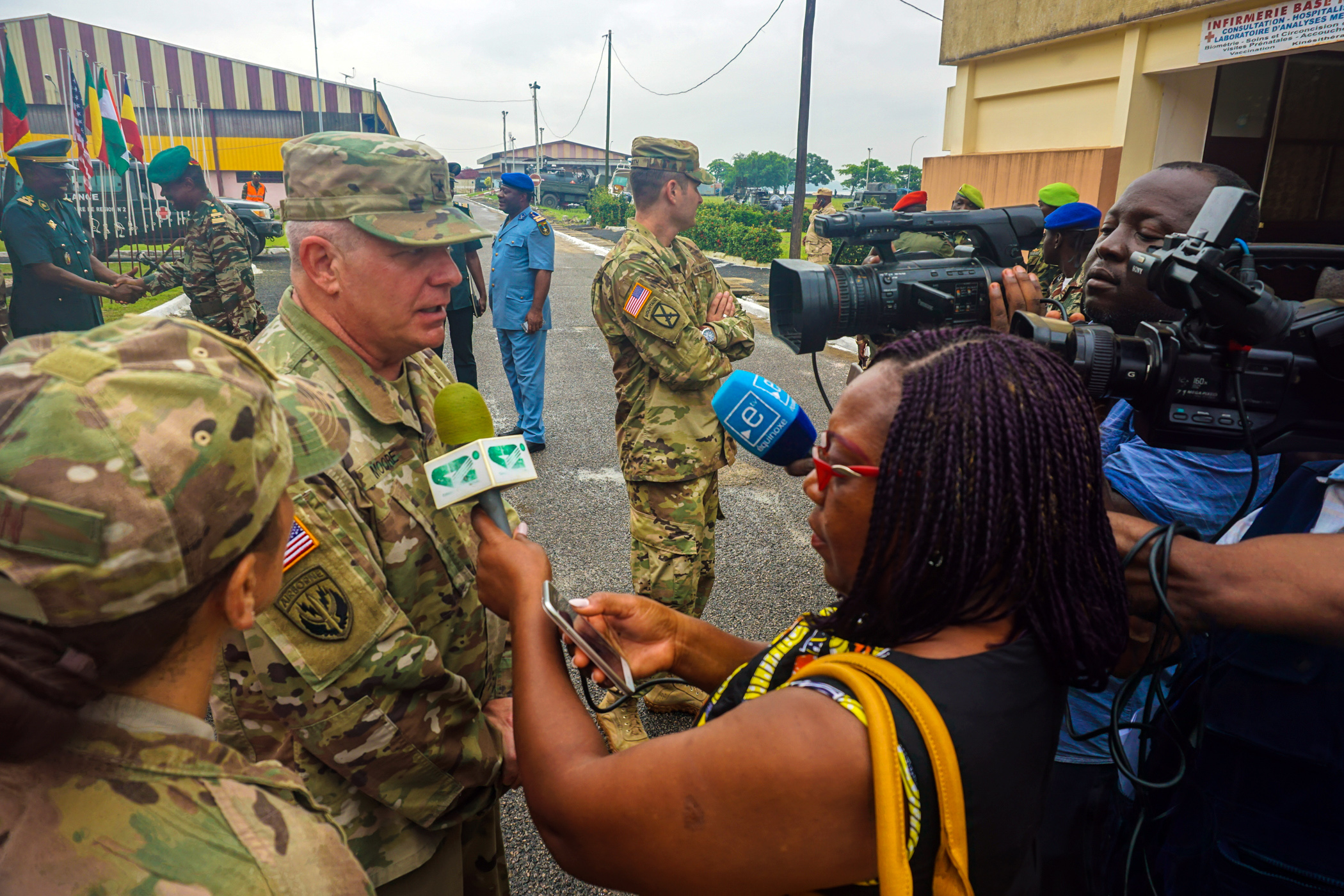 U.S. Army Brig. Gen. Kenneth Moore, U.S. Army Africa deputy commander, answers questions for local journalists following the opening ceremony for exercise Unified Focus 2017, held on the Douala Naval Base, April 24, 2017. UF 17 is a weeklong tabletop exercise that brings the military partners of the Lake Chad Basin area’s Multinational Joint Task Force (MNJTF) together to practice joint planning and coordination through a series of scripted vignettes. (Photo courtesy of U.S. Army Africa Public Affairs/Released)