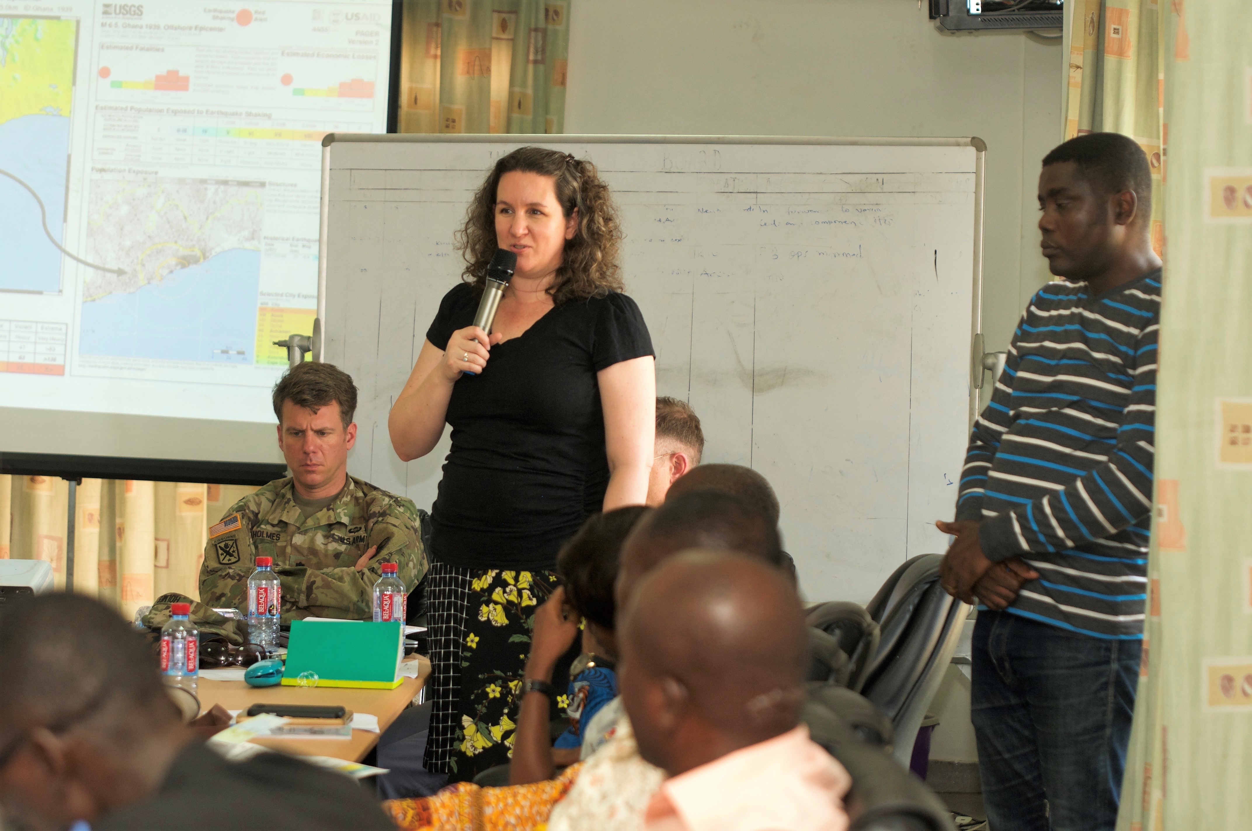U.S. Africa Command Foreign Policy Advisor Robin Cromer discusses embassy coordination during a tabletop exercise. AFRICOM and Ghana’s National Disaster Management Organization (NADMO) co-sponsored a natural disaster response forum in Accra. The event brought together experts in disaster management from multiple organizations in Ghana and the U.S. and was conducted at the Ghana Armed Forces Command and Staff College, March 12-15, 2018. (U.S. AFRICOM photo)