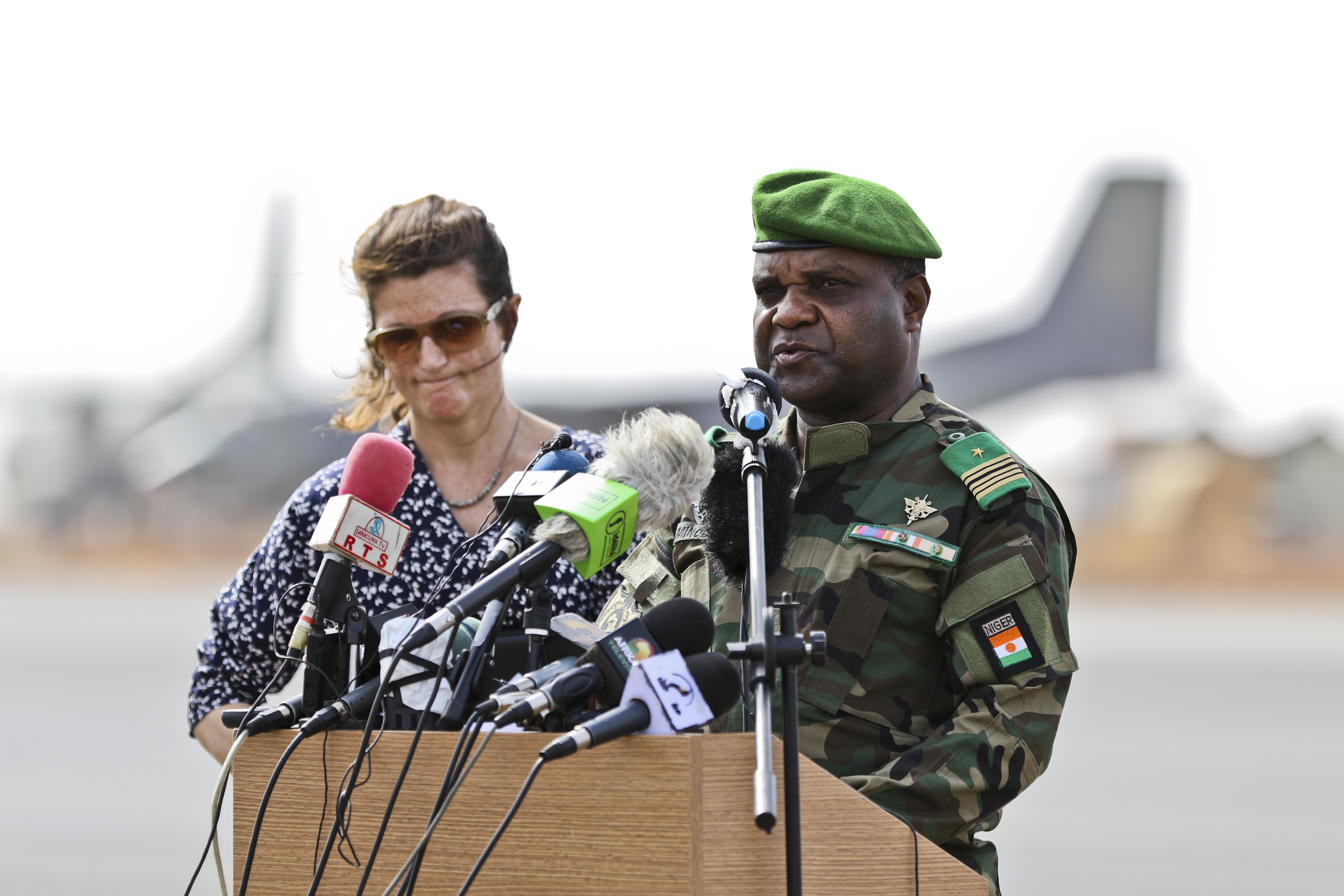 NIAMEY, Niger – Col. Maj. Sani Mahamane Laminou, Flintlock Exercise Director, speaks during the opening ceremony of Flintlock 2018 in Niamey, Niger, April 11, 2018. Flintlock, hosted by Niger, with key outstations at Burkina Faso and Senegal, is designed to strengthen the ability of key partner nations in the region to counter violent extremist organizations, protect their borders, and provide security for their people. (U.S. Army Photo by Sgt. Heather Doppke/79th Theater Sustainment Command)