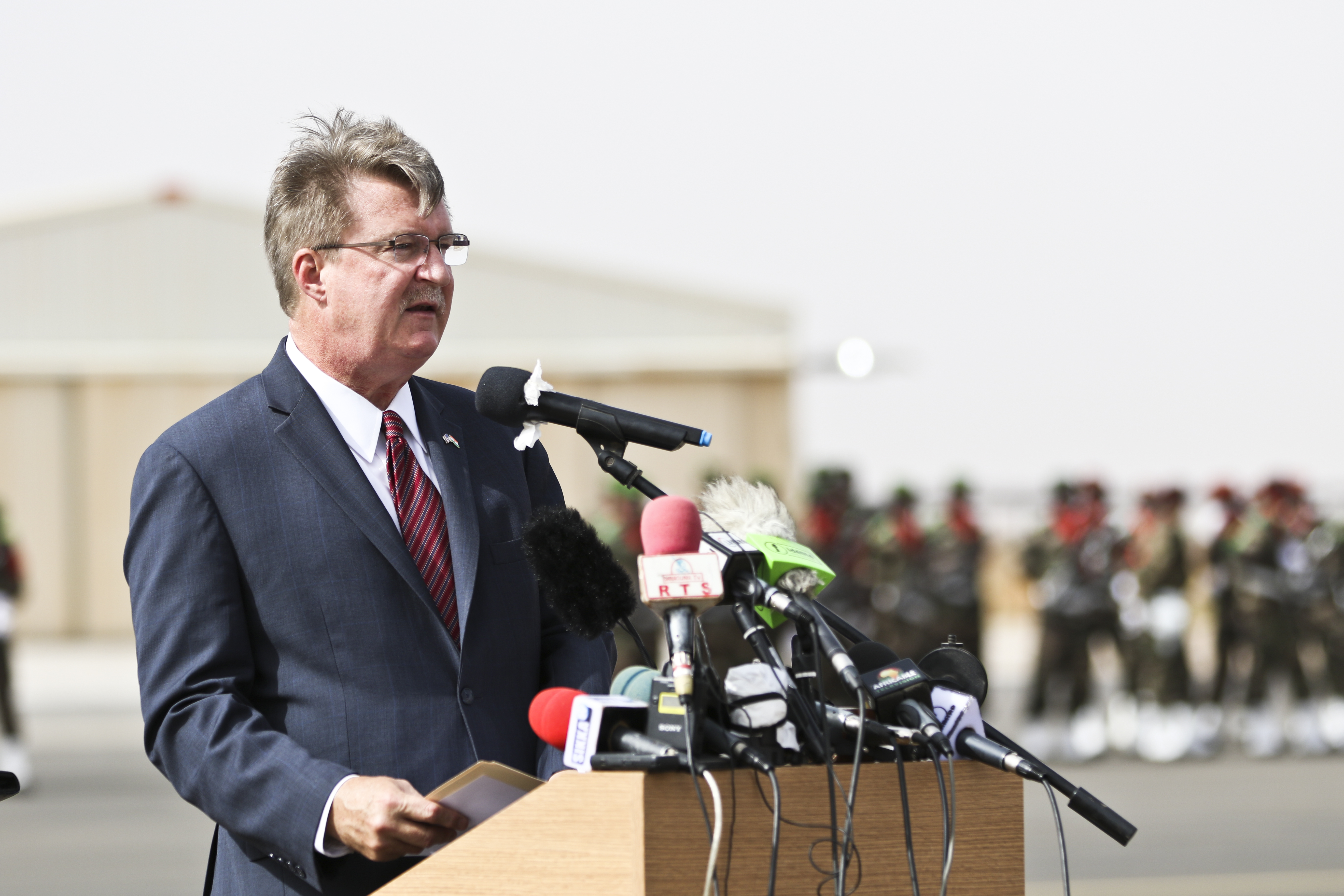 NIAMEY, Niger – Amb. Eric Whitaker, U.S. Ambassador to Niger, gives a speech during the opening ceremony of Flintlock 2018 in Niamey, Niger, April 11, 2018. Flintlock is an annual, African-led, integrated military and law enforcement exercise that has strengthened key partner nation forces throughout North and West Africa as well as western Special Operations Forces since 2005. (U.S. Army Photo by Sgt. Heather Doppke/79th Theater Sustainment Command)