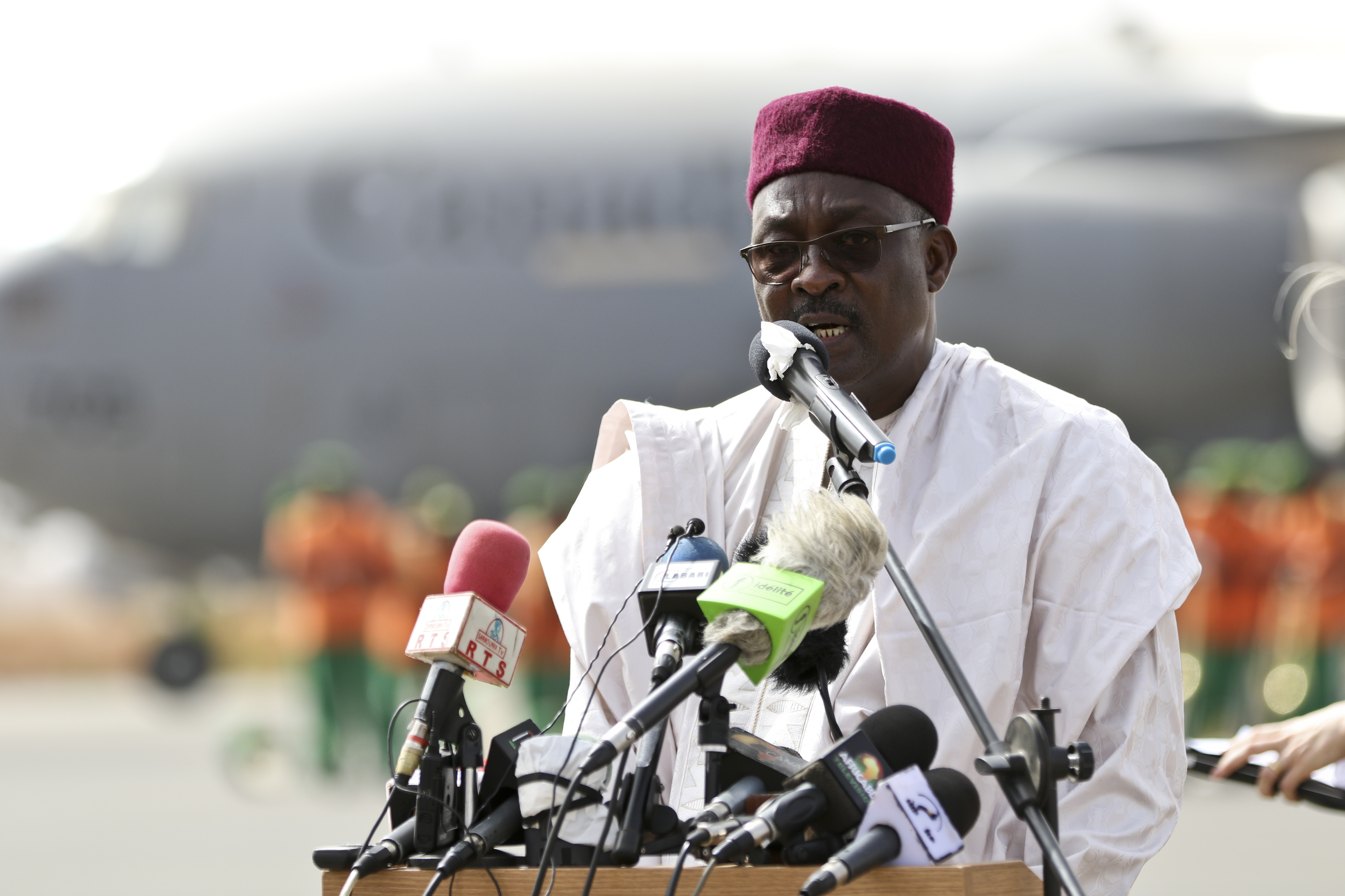 NIAMEY, Niger – Moutari Kalla, Nigerien Minister of Defense, speaks during the opening ceremony of Flintlock 2018 in Niamey, Niger, April 11, 2018. Approximately 1,900 service members from more than 20 African and western partner nations are participating in Flintlock 2018 at multiple locations in Niger, Burkina Faso, and Senegal. (U.S. Army Photo by Sgt. Heather Doppke/79th Theater Sustainment Command)