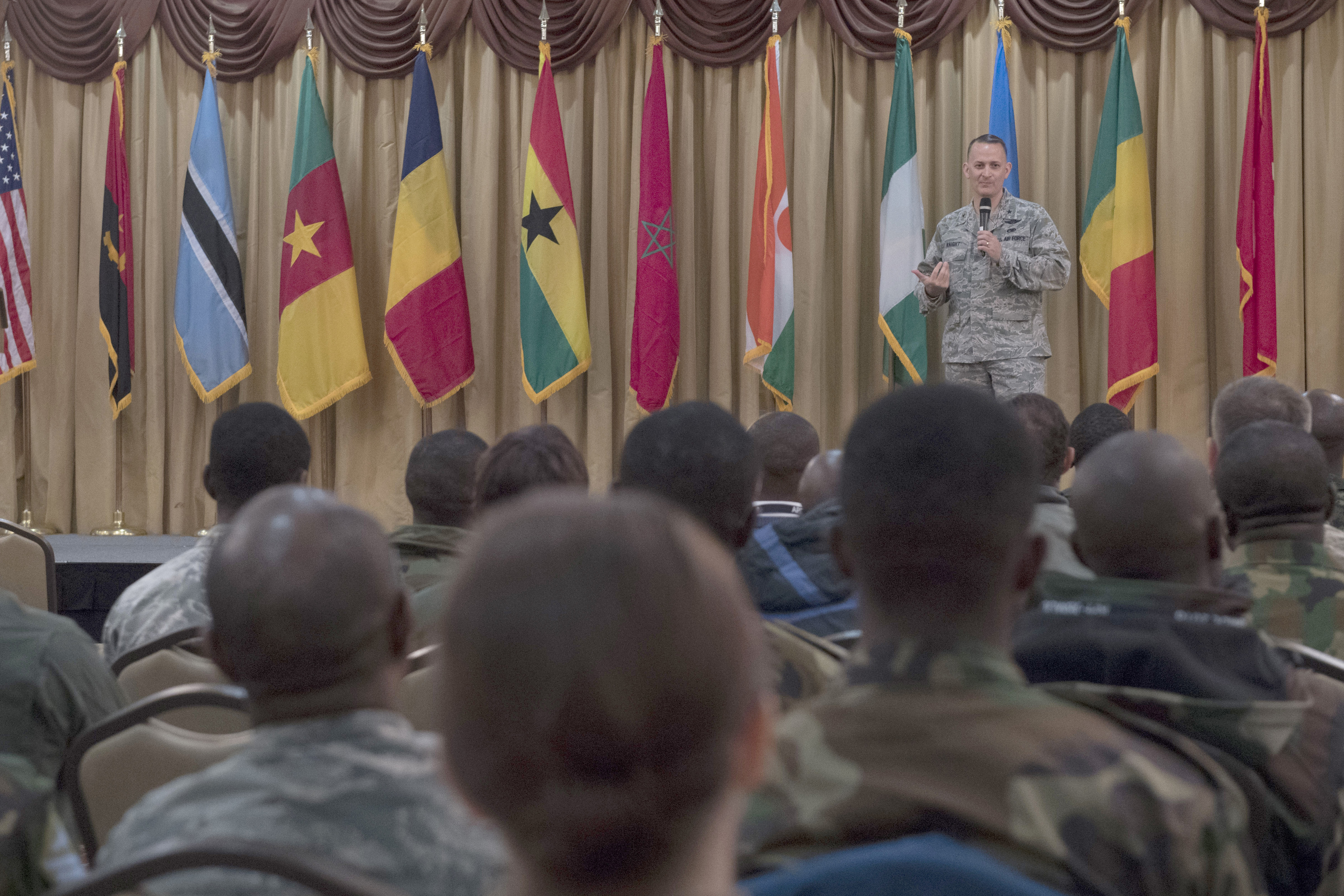 Brig. Gen. William Knight, U.S. Air Force Expeditionary Center vice commander, speaks during the opening ceremony of the African Partnership Flight at Joint Base McGuire-Dix-Lakehurst, N.J., April 16, 2018. Thirteen African countries participated in the week-long engagement. (U.S. Air Force photo by Tech. Sgt. Gustavo Gonzalez)