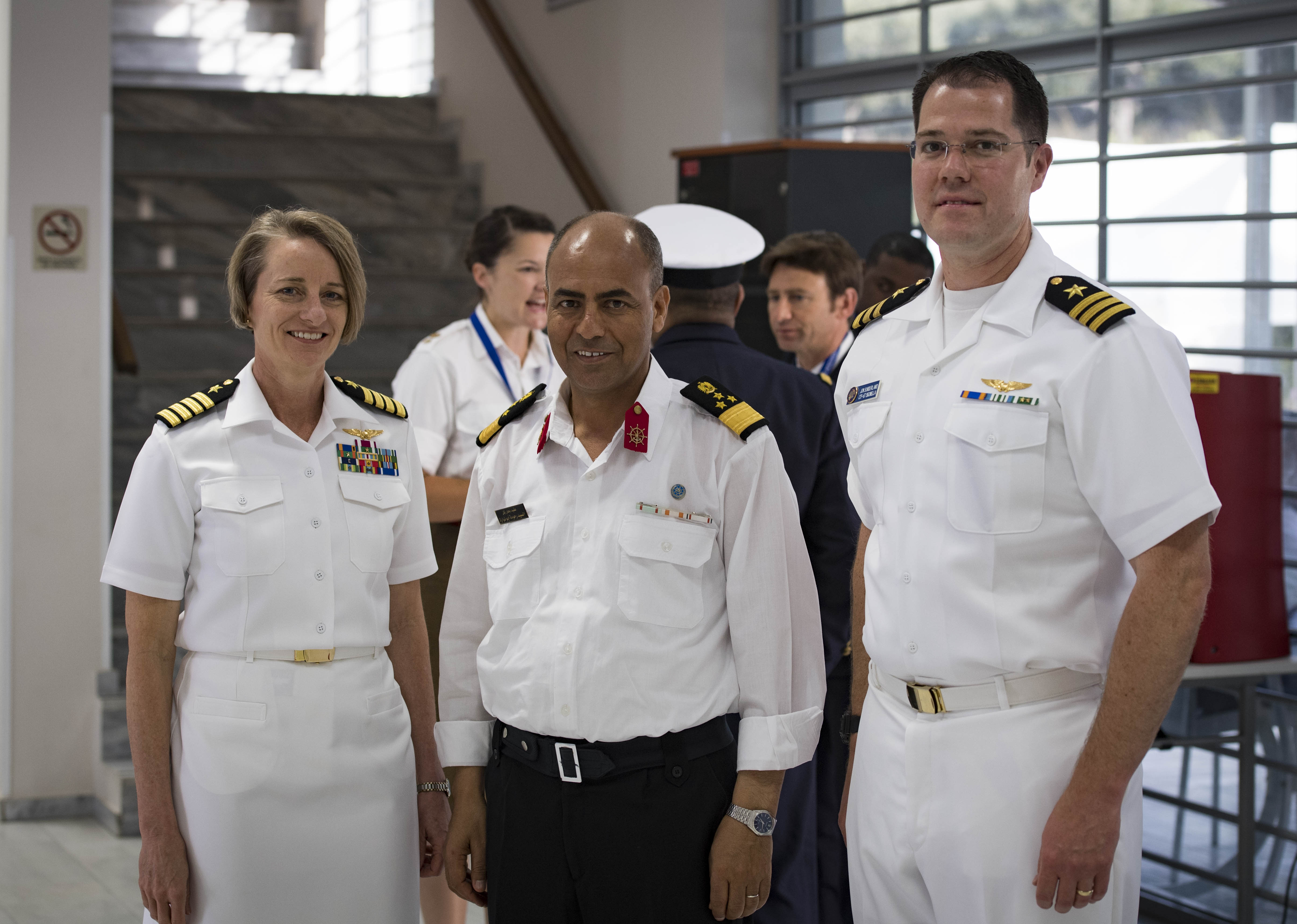 SOUDA BAY, Greece (May 3, 2018) Capt. Amy Egeli, left, Libian Coast Guard Commodore Essaid Rohuma Mohamed Abu Nwara, center, and Cmdr. Jon Sunderland pose for a photo during exercise Phoenix Express 2018, May 3. Phoenix Express is sponsored by U.S. Africa Command and facilitated by U.S. Naval Forces Europe-Africa/U.S. 6th Fleet, and is designed to improve regional cooperation, increase maritime domain awareness information sharing practices, and operational capabilities to enhance efforts to achieve safety and security in the Mediterranean Sea. (U.S. Navy photo by Mass Communication Specialist 2nd Class Ryan U. Kledzik/Released)