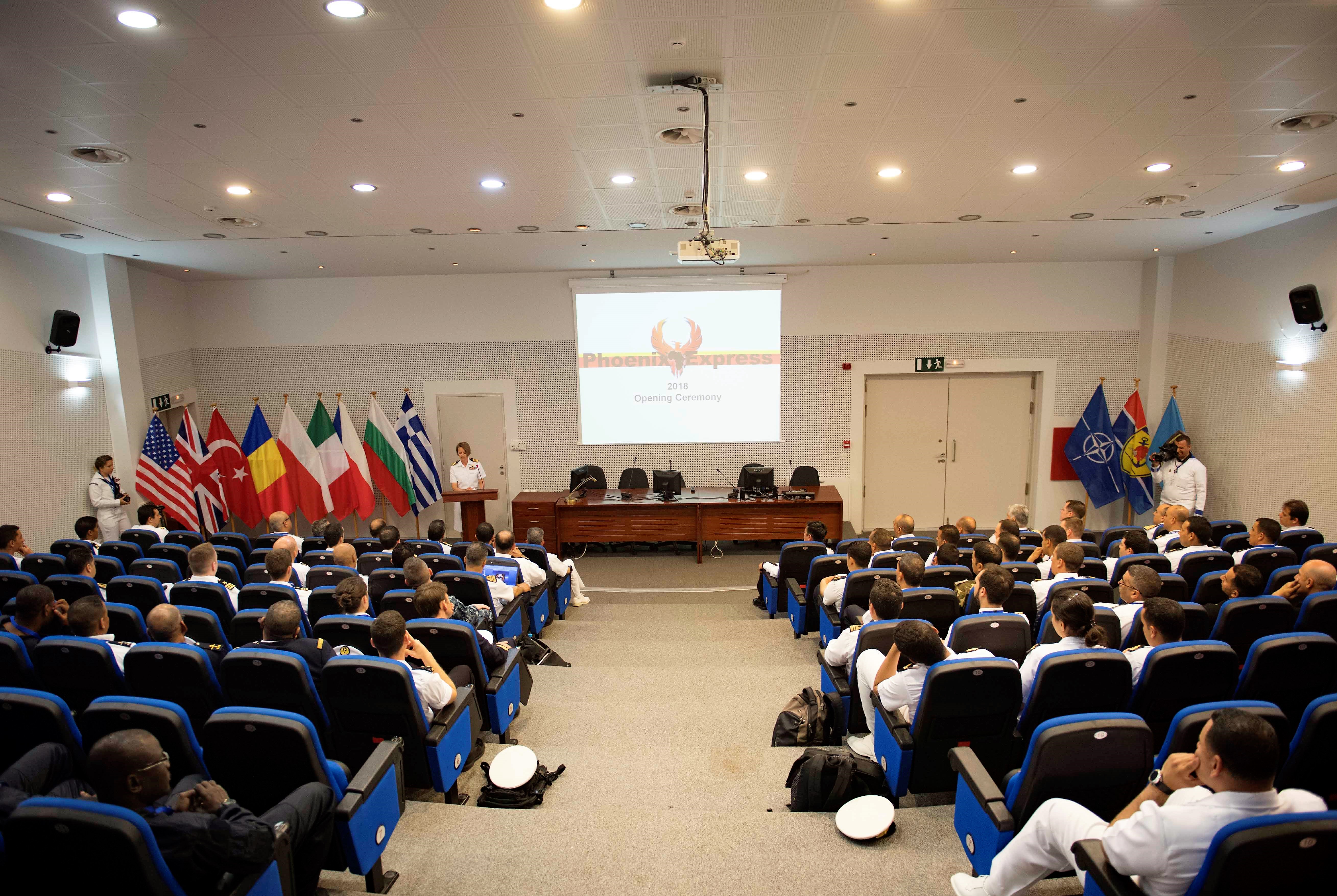 SOUDA BAY, Greece (May 3, 2018) Capt. Amy Egeli, exercise director of Phoenix Express 2018, delivers remarks at the exercise’s pre-sail conference, May 3, 2018. Phoenix Express is sponsored by U.S. Africa Command and facilitated by U.S. Naval Forces Europe-Africa/U.S. 6th Fleet, and is designed to improve regional cooperation, increase maritime domain awareness information sharing practices, and operational capabilities to enhance efforts to achieve safety and security in the Mediterranean Sea. (U.S. Navy photo by Mass Communication Specialist 2nd Class Ryan U. Kledzik/Released)