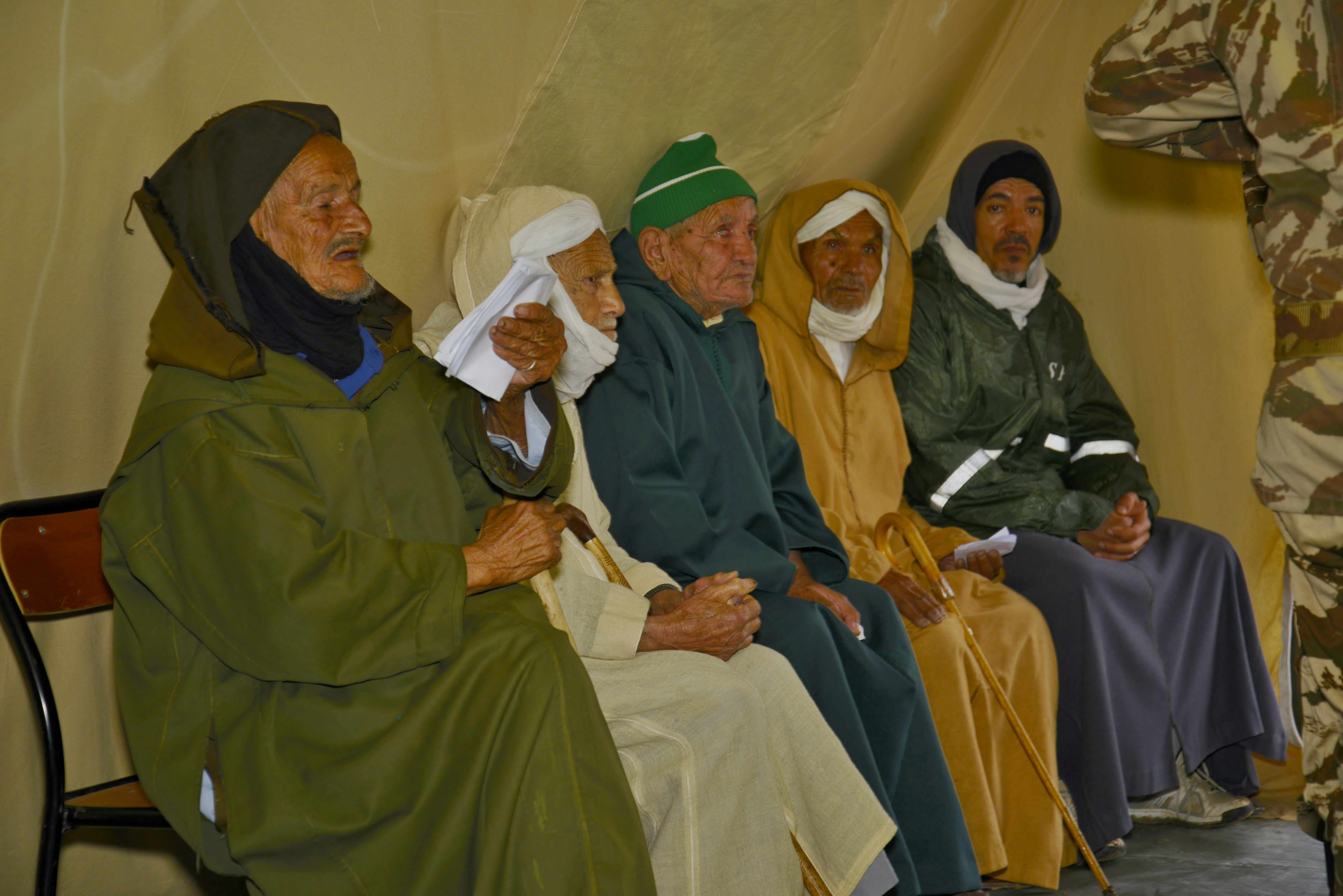 Moroccan Men waiting for surgical services during the Humanitarian Civic Assistance component of Exercise African Lion 2018 in Bounaamane, Morocco, April 25, 2018. Exercise African Lion 2018 is a Chairman of the Joint Chiefs of Staff-sponsored, U.S. African Command-scheduled, U.S. Marine Corps Forces Europe and Africa-led, joint and combined exercise conducted in the Kingdom of Morocco. African Lion offers an opportunity to improve interoperability and cooperation while demonstrating the strong military bond that exists between the participating nations. (U.S. Army National Guard photo by Maj. Samantha Madsen)