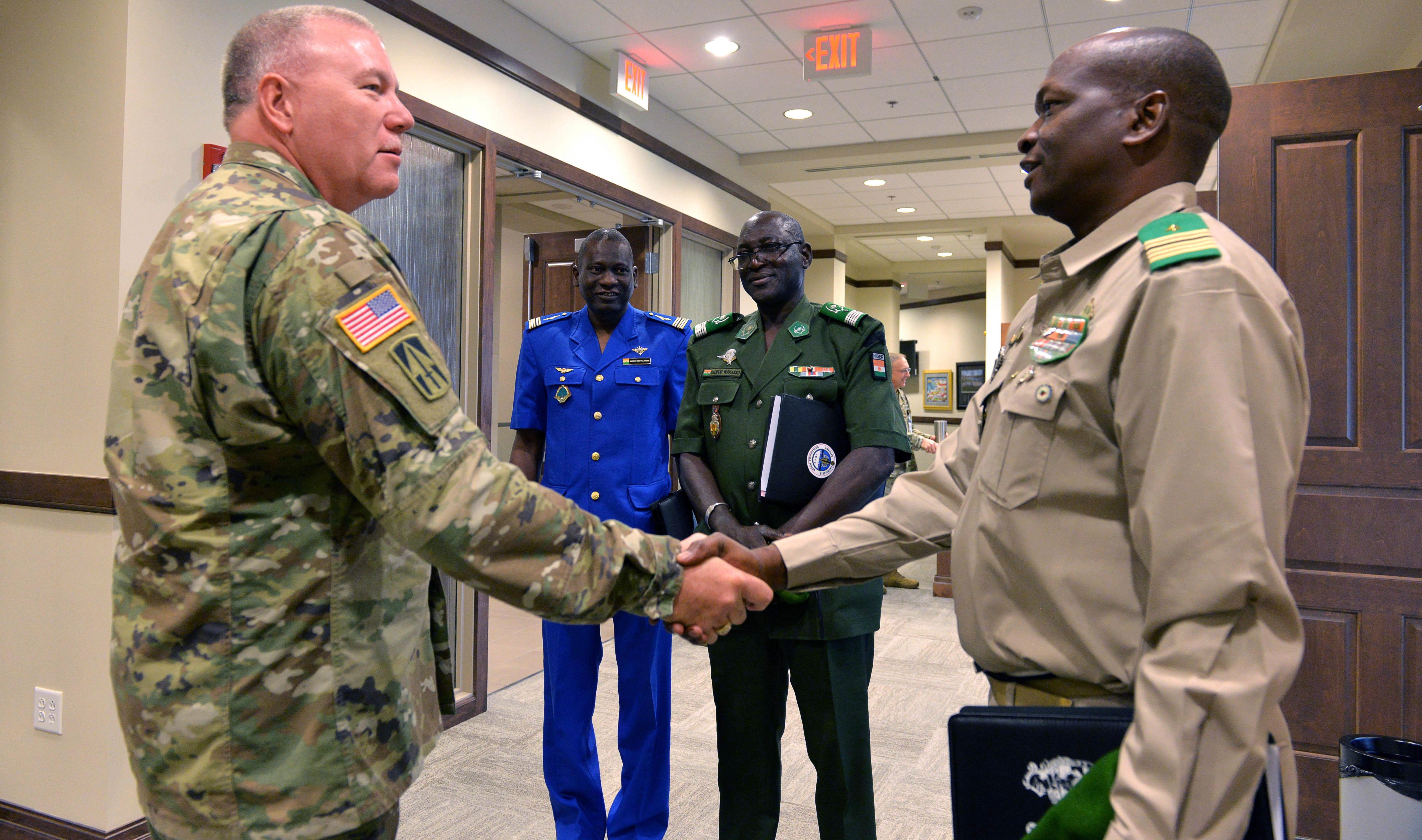 Indiana National Guard’s Director of Joint Staff Brig. Gen. Ronald A. Westfall greats Colonel-Major Soumana Kalkoye dit Fodo the Chief of Bureau of Studies for the Nigerien Ministry of Defense. Photo by Sgt. 1st Class Lasima O. Packett